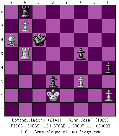 Last move : 1-0 2007 September 19 21:59:43 [Event "FICGS__CHESS__WCH_STAGE_1_GROUP_11__000003"] [Site "FICGS"] [Date "2007.07.11"] [Round "1"] [White "Domanov,Dmitry"] [Black "Riha,Josef"] [Result "1-0"] [WhiteElo "2141"] [BlackElo "1969"] 1.e4 c5 2.Nf3 d6 3.d4 cxd4 4.Nxd4 Nf6 5.Nc3 a6 6.Be3 e5 7.Nb3 Be6 8.f3 Be7 9.Qd2 O-O 10.O-O-O Nbd7 11.g4 b5 12.g5 Nh5 13.Nd5 Bxd5 14.exd5 f6 15.g6 hxg6 16.Na5 f5 17.Nc6 Qe8 18.Rg1 Bd8 19.Kb1 Kh7 20.Qf2 Bc7 21.Be2 Ndf6 22.c4 bxc4 23.Bxc4 e4 24.Bd4 a5 25.Rde1 Qf7 26.Rg2 Rac8 27.Reg1 Bd8 28.Bb3 a4 29.Bc2 e3 30.Qh4 Rxc6 31.dxc6 Nd5 32.Qxh5+ gxh5 33.Rxg7+ Qxg7 34.Rxg7+ Kh6 35.Rg1 Bf6 36.Bxf6 Rxf6 37.Bxa4 Rf8 38.Bb5 Rc8 39.Rd1 Nf4 40.a4 d5 41.Kc2 Re8 42.b4 Kg5 43.Ba6 Ne6 44.Be2 Nf4 45.Re1 Kf6 46.b5 Rc8 47.a5 Ke5 48.b6 Rxc6+ 49.Kb1 Kd6 50.Ba6 Ne6 51.Rxe3 Nc5 52.Bb5 Rc8 53.a6 Nxa6 54.Bxa6 Rb8 55.b7 d4 56.Re2 d3 57.Rb2 Kc7 58.Kc1 h4 59.Rb5 Kc6 60.Kd2 1-0 Sicilian : Najdorf, Byrne (English) attack Kingside Castling by player Black (move 9) Queenside Castling by player White (move 10) Player White won this chess game. Follow this game move after move (download)By this measure (on the gap between Fischer & his contemporaries), I consider him the greatest world champion. (Garry Kasparov) Das Schachspiel ist ein See, in welchem eine Mücke baden und ein Elefant ertrinken kann. (Emanuel Lasker) Fischer era un maestro de claridad y un Rey del posicionamiento astuto. Sus oponentes podían ver hacia donde se dirigía pero eran impotentes para detenerlo. (Bruce Pandolfini) Le pion, dans sa simplicité, marche droit devant lui, mais lorsqu'il prend, il le fait obliquement? Ainsi l'homme, tant qu'il reste pauvre, marche dans la droiture et vit honnêtement, mais lorsqu'il recherche les honneurs, il flatte, se parjure et, par les voies obliques, cherche une position supérieure sur l'échiquier du monde. (Jean de Galles) Art is the triumph over chaos. (John Cheever)