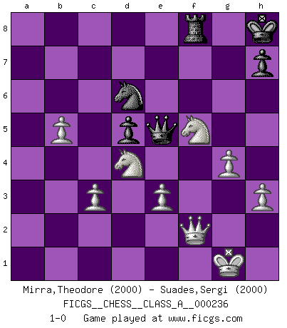 Last move : 1-0 2020 November 26 0:4:5 [Event "FICGS__CHESS__CLASS_A__000236"] [Site "FICGS"] [Date "2020.08.28"] [Round "1"] [White "Mirra,Theodore"] [Black "Suades,Sergi"] [Result "1-0"] [WhiteElo "2000"] [BlackElo "2000"] 1.e4 e5 2.Nf3 Nc6 3.Bb5 a6 4.Ba4 Nf6 5.O-O Nxe4 6.d4 b5 7.Bb3 d5 8.dxe5 Be6 9.c3 Be7 10.Be3 Qd7 11.Nbd2 O-O 12.Bc2 f5 13.exf6 Nxf6 14.Qb1 Bd6 15.Re1 Kh8 16.b4 Rae8 17.a4 Bg4 18.axb5 axb5 19.Nd4 Nh5 20.Nxb5 Bf4 21.Bd1 Bxe3 22.fxe3 Ne5 23.Nd4 Qd6 24.b5 Nf6 25.Ra6 Qe7 26.Bxg4 Nfxg4 27.h3 Nf2 28.Re2 Qf7 29.Ra7 Qf6 30.Rxc7 Qb6 31.Rxf2 Rxf2 32.Rxg7 Kxg7 33.Kxf2 Qc5 34.Qc2 Kh8 35.Kg1 Rf8 36.Nf1 Qe7 37.Ng3 Nc4 38.Ngf5 Qe5 39.Qf2 Nd6 40.g4 1-0 Follow this game move after move (download)The mistakes are there, waiting to be made. (Savielly Tartakower) Kein Schachspieler kann gut schlafen. (H. G. Wells) Cada Peón es una Reina en potencia. (James Mason) Les échecs, c'est la lutte contre l'erreur. (Johannes Zukertort) If you are good, you will be assigned all the work. If you are really good, you will get out of it. (Dan Rotaru)