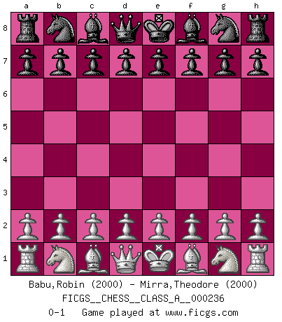 Last move : 0-1 2020 October 7 11:59:10 [Event "FICGS__CHESS__CLASS_A__000236"] [Site "FICGS"] [Date "2020.08.28"] [Round "1"] [White "Babu,Robin"] [Black "Mirra,Theodore"] [Result "0-1"] [WhiteElo "2000"] [BlackElo "2000"] 0-1 This chess game has been lost on time (started : 2020.08.28 8:45:31) Player Black won this chess game. Follow this game move after move (download)Pawn endings are to Chess what putting is to golf. (Cecil Purdy) Über Frauen: Chess is better. (Robert James Fischer) El Rey es una pieza de pelea. ¡Usenlo!. (Wilhelm Steinitz) Il (Jacob Murray) ne joue pas pour le bon coup, mais pour le meilleur. (Eloi Relange) Players are not good because they find tactics, it is about the way to find the positions in which those tactics are hidden. (Luc-Olivier Leclerc)
