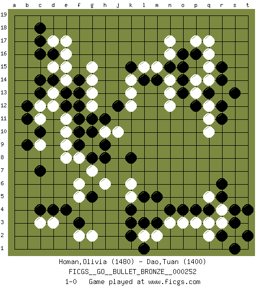 Last move : 1-0 2020 August 31 21:52:38 [Event "FICGS__GO__BULLET_BRONZE__000252"] [Site "FICGS"] [Date "2020.08.31"] [Round "1"] [Black "Homan,Olivia"] [White "Dao,Tuan"] [Result "1-0"] [Rating 1 "1480"] [Rating 2 "1400"] 1.d16 q17 2.d4 q3 3.r5 c3 4.p4 p3 5.o4 o3 6.n4 n3 7.c4 d3 8.e4 f2 9.r15 m4 10.m5 l4 11.p16 p17 12.o16 n17 13.l5 k5 14.k4 k6 15.f3 g2 16.k3 l2 17.k2 c9 18.m3 q10 19.r12 n16 20.c13 r4 21.s4 q5 22.q4 r3 23.r6 c12 24.b12 q12 25.r11 r13 26.s13 d13 27.c14 c11 28.s3 m2 29.l3 q11 30.n15 m15 31.m14 n14 32.o15 q16 33.o14 q15 34.q13 q14 35.r14 p13 36.l14 s2 37.t2 t3 38.t4 d17 39.c17 e17 40.c18 e16 41.r2 q2 42.s1 n13 43.l1 d15 44.c16 l15 45.d14 e14 46.e13 d12 47.o13 n12 48.f14 e15 49.p12 p14 50.f12 g14 51.f10 g13 52.b11 e8 53.g8 g9 54.f9 f8 55.h9 g12 56.g11 g7 57.h8 f6 58.f13 g15 59.c7 e9 60.k15 k14 61.g5 e11 62.f11 h10 63.h11 j10 64.g10 h6 65.k8 k12 66.j12 k13 67.c10 e10 68.b9 f5 69.e12 1-0 Here are the names of the openings (joseki) played in the four corners : Corner q4 : q3 r5 Komoku (Somok, Xiao~mu`) 3-4 Point. The komoku (3-4) point is the traditional corner enclosure move.. Ikken Kakari (Hankan Keolch'im, Yi Gua`jiao~, 1-Space Low Pincer). The small knight move is the basic approach move to the 3-4 point stone. It has been continually used for over four centuries. There are limitless variations, with new moves constantly being discovered. Black 2 opens the door to a treaure store of joseki. Corner d4 : d4 c3 Hoshi (Hwajeom, Seongjeom, Xingwei`) 4-4 Point. The star or hoshi (4-4) point, emphasizing influence at the potential expense of territory. Corner q16 : q17 r15 Komoku (Somok, Xiao~mu`) 3-4 Point. The komoku (3-4) point is the traditional corner enclosure move.. Ikken Kakari (Hankan Keolch'im, Yi Gua`jiao~, 1-Space Low Pincer). The small knight move is the basic approach move to the 3-4 point stone. It has been continually used for over four centuries. There are limitless variations, with new moves constantly being discovered. Black 2 opens the door to a treaure store of joseki. Player Black won this Go (weiqi, baduk) game. Follow this game move after move (download)Six eyes in a rectangle are alive. (Anonymous) I think your argument is specious - I think your tie is ugly. (Gregory House to Dr. Foreman, House M.D.)