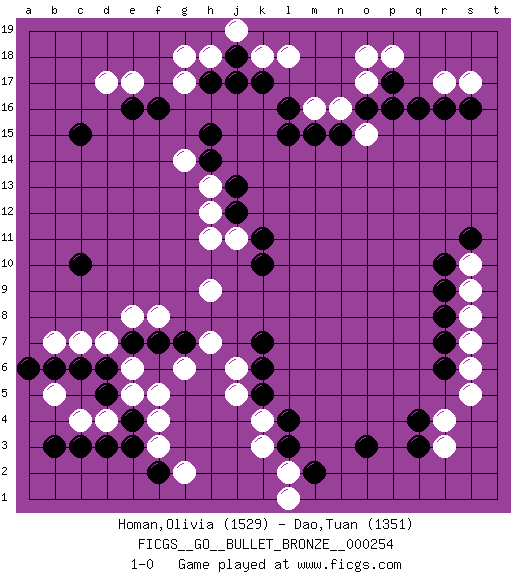 Last move : 1-0 2020 August 31 23:4:11 [Event "FICGS__GO__BULLET_BRONZE__000254"] [Site "FICGS"] [Date "2020.08.31"] [Round "1"] [Black "Homan,Olivia"] [White "Dao,Tuan"] [Result "1-0"] [Rating 1 "1529"] [Rating 2 "1351"] 1.q16 d4 2.q4 d17 3.c3 c4 4.d3 f3 5.f2 g2 6.e3 f4 7.e4 e5 8.d5 b5 9.d6 e6 10.e7 f5 11.b3 d7 12.c6 c7 13.b6 b7 14.a6 e8 15.f7 f8 16.g7 h9 17.c15 h7 18.e16 e17 19.f16 g17 20.c10 g6 21.o3 o17 22.o16 n16 23.p17 o15 24.p16 o18 25.n15 m16 26.m15 p18 27.l15 r17 28.r16 s17 29.l16 s5 30.s16 l18 31.k17 k18 32.r6 s6 33.h17 h18 34.j18 j19 35.j17 g18 36.r7 s7 37.r8 s8 38.r9 s9 39.r10 s10 40.s11 r3 41.q3 r4 42.l3 k3 43.l4 k4 44.k5 j5 45.k6 j6 46.k7 l2 47.m2 l1 48.k10 h11 49.j12 h12 50.j13 h13 51.h14 j11 52.k11 g14 53.h15 1-0 Here are the names of the openings (joseki) played in the four corners : Corner d4 : d4 c3 Hoshi (Hwajeom, Seongjeom, Xingwei`) 4-4 Point. The star or hoshi (4-4) point, emphasizing influence at the potential expense of territory. Corner d16 : d17 c15 Komoku (Somok, Xiao~mu`) 3-4 Point. The komoku (3-4) point is the traditional corner enclosure move.. Ikken Kakari (Hankan Keolch'im, Yi Gua`jiao~, 1-Space Low Pincer). The small knight move is the basic approach move to the 3-4 point stone. It has been continually used for over four centuries. There are limitless variations, with new moves constantly being discovered. Black 2 opens the door to a treaure store of joseki. Corner q16 : q16 o17 Hoshi (Hwajeom, Seongjeom, Xingwei`) 4-4 Point. The star or hoshi (4-4) point, emphasizing influence at the potential expense of territory. Ikken Kakari (Hankan Keolch'im, Yi Gua`jiao~, 1-Space Low Approach). White 2 is the standard approach move to the 4-4. Player Black won this Go (weiqi, baduk) game. Follow this game move after move (download)Josekis are not fixed, definitive things. They indicate the moments when everything can change. (Pierre Audouard) Remember : Your focus determines your reality. (Qui-Gon Jinn in Star Wars ep.1)