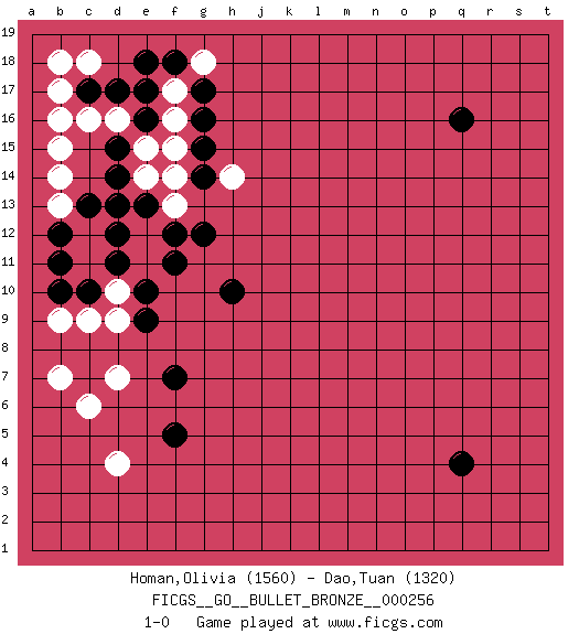 Last move : 1-0 2020 August 31 23:40:40 [Event "FICGS__GO__BULLET_BRONZE__000256"] [Site "FICGS"] [Date "2020.08.31"] [Round "1"] [Black "Homan,Olivia"] [White "Dao,Tuan"] [Result "1-0"] [Rating 1 "1560"] [Rating 2 "1320"] 1.q16 d16 2.q4 d4 3.c17 c16 4.d17 f17 5.f18 g18 6.e17 f16 7.e16 e15 8.d15 b15 9.d14 e14 10.e13 f13 11.c13 e12 12.d13 b17 13.e18 c11 14.g17 f14 15.f12 c18 16.g16 e11 17.b11 c12 18.b12 b14 19.c10 b13 20.g12 h14 21.d11 d10 22.d12 b18 23.e10 d9 24.f11 f15 25.g15 b16 26.g14 c9 27.e9 b9 28.b10 c6 29.h10 b7 30.f7 d7 31.f5 1-0 Here are the names of the openings (joseki) played in the four corners : Corner d16 : d16 c17 Hoshi (Hwajeom, Seongjeom, Xingwei`) 4-4 Point. The star or hoshi (4-4) point, emphasizing influence at the potential expense of territory. Player Black won this Go (weiqi, baduk) game. Follow this game move after move (download)Don't disturb symmetry. (Anonymous) The mind is like a parachute, it only functions when its open. (Unknown)