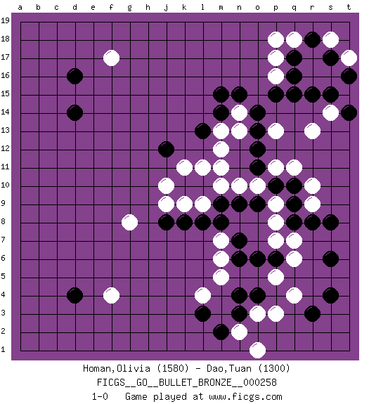 Last move : 1-0 2020 September 1 8:15:27 [Event "FICGS__GO__BULLET_BRONZE__000258"] [Site "FICGS"] [Date "2020.09.01"] [Round "1"] [Black "Homan,Olivia"] [White "Dao,Tuan"] [Result "1-0"] [Rating 1 "1580"] [Rating 2 "1300"] 1.k10 q4 2.o4 q6 3.q8 o3 4.n3 p3 5.d4 r16 6.d16 p16 7.n4 f17 8.d14 r10 9.q10 q11 10.p10 r9 11.r8 p11 12.o11 o10 13.o9 n10 14.o12 p13 15.n9 m10 16.m9 l11 17.l10 m11 18.l13 m13 19.m14 n13 20.q17 p17 21.q16 r17 22.q15 q18 23.r18 p18 24.o13 n14 25.r15 s18 26.o14 r13 27.n15 m12 28.m15 k11 29.p15 j10 30.s8 s14 31.s17 s16 32.s15 t17 33.t14 t15 34.t16 p9 35.q9 t15 36.j12 j9 37.t16 p8 38.s17 p7 39.s6 m6 40.s4 l4 41.k8 k9 42.l8 l9 43.j8 f4 44.n7 m7 45.m8 g8 46.n6 m5 47.p6 p5 48.o6 q7 49.r3 n2 50.m2 o1 51.l3 1-0 Here are the names of the openings (joseki) played in the four corners : Corner q4 : q4 o4 Hoshi (Hwajeom, Seongjeom, Xingwei`) 4-4 Point. The star or hoshi (4-4) point, emphasizing influence at the potential expense of territory. Ikken Takagakari (Hankan Nop'dakeolch'im, Yi Gaojia, 1-Space High Approach). White typically responds at 6-4 or 3-10. White 4-10 is played when White finds play on the right side advantageous. White 4-8 or 3-8 may be played when White has support at top. Corner d16 : d16 f17 Hoshi (Hwajeom, Seongjeom, Xingwei`) 4-4 Point. The star or hoshi (4-4) point, emphasizing influence at the potential expense of territory. Ikken Kakari (Hankan Keolch'im, Yi Gua`jiao~, 1-Space Low Approach). White 2 is the standard approach move to the 4-4. Corner d4 : d4 j9 Hoshi (Hwajeom, Seongjeom, Xingwei`) 4-4 Point. The star or hoshi (4-4) point, emphasizing influence at the potential expense of territory. Player Black won this Go (weiqi, baduk) game. Follow this game move after move (download)If you have won four corners, resign. (Anonymous) If we knew what we were doing, we would not call it research. (Albert Einstein)