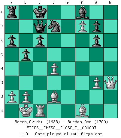 Last move : 1-0 2006 July 22 1:2:45 [Event "FICGS__CHESS__CLASS_C__000007"] [Site "FICGS"] [Date "2006.06.21"] [Round "1"] [White "Baron,Ovidiu"] [Black "Burden,Don"] [Result "1-0"] [WhiteElo "1623"] [BlackElo "1700"] 1.Nf3 d5 2.d4 Bf5 3.c4 e6 4.Nc3 Nf6 5.e3 c6 6.Nh4 Be4 7.f3 Bg6 8.Qb3 Qc7 9.Bd2 Be7 10.Rc1 a6 11.cxd5 Nxd5 12.Nxg6 hxg6 13.Nxd5 exd5 14.Kd1 Bd6 15.e4 dxe4 16.fxe4 Rxh2 17.Rxh2 Bxh2 18.Kc2 b5 19.Qh3 Bd6 20.e5 Bf8 21.e6 Kd8 22.exf7 Nd7 23.Kb1 Kc8 24.g3 1-0 Reti Opening Player White won this chess game. Follow this game move after move (download)Chess is above all, a fight ! (Emanuel Lasker) Schachspieler können ausgezeichnet Varianten am Schachbrett berechnen, aber nicht im realen Leben. Zu stark ist der Individualismus im Schach ausgeprägt, und für viele ist ein kleiner momentaner persönlicher Vorteil wichtiger als ein weit größerer Vorteil von morgen. (Anatoly Karpov) El Ajedrez era la lengua materna de Capablanca. (Reti) Le génie consiste à savoir transgresser les règles au moment opportun. (Teichmann) Always be a first-rate version of yourself, instead of a second-rate version of somebody else. (Judy Garland)