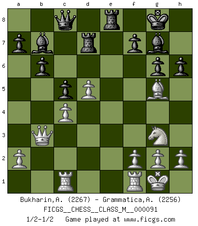 Last move : 1/2-1/2 2020 November 7 5:13:44 [Event "FICGS__CHESS__CLASS_M__000091"] [Site "FICGS"] [Date "2020.09.01"] [Round "1"] [White "Bukharin,Alexey"] [Black "Grammatica,Andrea"] [Result "1/2-1/2"] [WhiteElo "2267"] [BlackElo "2256"] 1.d4 Nf6 2.c4 g6 3.Nc3 d5 4.cxd5 Nxd5 5.e4 Nxc3 6.bxc3 Bg7 7.Bc4 c5 8.Ne2 Nc6 9.Be3 O-O 10.O-O b6 11.Bb5 Bb7 12.Rc1 Rc8 13.Bxc6 Rxc6 14.d5 Rd6 15.c4 e6 16.Qa4 exd5 17.exd5 Rd7 18.Bg5 Qc8 19.Qb3 Re8 20.Ng3 h6 1/2-1/2 Follow this game move after move (download)Half the variations which are calculated in a tournament game turn out to be completely superfluous. Unfortunately, no one knows in advance which half. (Jan Tinman) Über Karpov: Er war und ist ein Vertreter der russischen Reaktionäre. Das steckt tief in seiner Seele, wehalb ich nicht nett mit ihm umgehen kann. (Viktor Kortschnoi) Hoy en día, si tu no eres un Gran Maestro a los 14 años, es mejor que lo olvides. (Anand Viswanathan) Les échecs sont un jeu par leur forme, un art par leur essence et une science par sa difficulté d'acquisition. Ils peuvent vous procurer autant de plaisir qu'un bon livre ou une belle musique, mais vous n'aurez une réelle joie que si vous arrivez à bien jouer. (Tigran Petrosian) He is a liar. I just don't know what the lie is yet. (Horatio Caine, C.S.I. Miami)