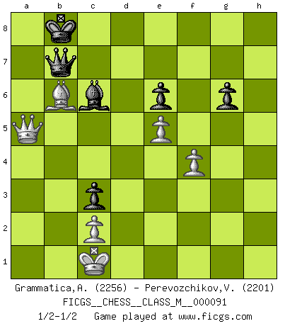 Last move : 1/2-1/2 2020 September 20 20:9:43 [Event "FICGS__CHESS__CLASS_M__000091"] [Site "FICGS"] [Date "2020.09.01"] [Round "1"] [White "Grammatica,Andrea"] [Black "Perevozchikov,Vjacheslav"] [Result "1/2-1/2"] [WhiteElo "2256"] [BlackElo "2201"] 1.e4 e6 2.d4 d5 3.Nc3 Bb4 4.e5 c5 5.a3 Bxc3+ 6.bxc3 Ne7 7.Qg4 cxd4 8.Qxg7 Rg8 9.Qxh7 Qc7 10.Ne2 Nbc6 11.f4 dxc3 12.h4 Bd7 13.Qd3 O-O-O 14.h5 d4 15.h6 Rg6 16.h7 Rh8 17.Nxd4 Nxd4 18.Qxd4 Bc6 19.Bd3 Rxg2 20.Be3 Rg7 21.Rh3 b6 22.O-O-O Kb7 23.Rg1 Ng6 24.a4 Rgxh7 25.Rxh7 Rxh7 26.a5 Rh1 27.Rxh1 Bxh1 28.axb6 axb6 29.Qa4 Bc6 30.Qa6+ Kb8 31.Bxb6 Qb7 32.Qa5 Bd7 33.Be4 Bc6 34.Bxg6 fxg6 1/2-1/2 French : Winawer, Advance, poisoned pawn variation Queenside Castling by player Black (move 13) Queenside Castling by player White (move 22) This chess game ended in a draw. Follow this game move after move (download)Chess is above all, a fight ! (Emanuel Lasker) Man gibt nur Pakete auf. (Paul Keres) Aquellos que dicen entender al Ajedrez, no entienden nada. (Robert Hubner) Le génie consiste à savoir transgresser les règles au moment opportun. (Teichmann) It's not enough to succeed. Others must fail. (Gore Vidal)