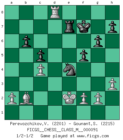 Last move : 1/2-1/2 2020 October 10 1:42:42 [Event "FICGS__CHESS__CLASS_M__000091"] [Site "FICGS"] [Date "2020.09.01"] [Round "1"] [White "Perevozchikov,Vjacheslav"] [Black "Gounant,Stanislas"] [Result "1/2-1/2"] [WhiteElo "2201"] [BlackElo "2215"] 1.Nf3 d5 2.c4 c6 3.d4 Nf6 4.Nc3 e6 5.e3 a6 6.b3 Bb4 7.Bd2 Nbd7 8.Bd3 O-O 9.O-O Bd6 10.Rc1 b6 11.Qc2 Bb7 12.e4 dxe4 13.Nxe4 Nxe4 14.Bxe4 f5 15.Bd3 c5 16.d5 Qf6 17.Bc3 Qh6 18.Rfe1 Rae8 19.h3 Nf6 20.Rcd1 exd5 21.Rxe8 Rxe8 22.cxd5 Ne4 23.Bb2 Qg6 24.Re1 Bxd5 25.Bxa6 Ba8 26.Qc4+ Kh8 27.Qc1 Re7 28.Kf1 Bd5 29.Bc4 Qe6 30.Bxd5 Qxd5 31.Rd1 Qe6 32.Qc4 Qxc4+ 33.bxc4 Kg8 34.Ng5 Nxg5 35.Rxd6 Ne4 36.Rd8+ Kf7 37.Ke2 g6 1/2-1/2 Reti Opening Kingside Castling by player Black (move 8) Kingside Castling by player White (move 9) This chess game ended in a draw. Follow this game move after move (download)Chess is everything: art, science and sport. (Anatoly Karpov) Korrekt heißt in Deutschland die Haltung eines Mannes, dessen Benehmen nach dem Urteile seiner Nachbarn seiner Stellung angemessen ist. Um korrekt zu sein, muß man sich der Meinung der anderen anpassen... (Emanuel Lasker) El Ajedrez detiene a su maestro dentro de sus propios vínculos, encadenando la mente y el cerebro, por lo que la libertad interior del mas fuerte debe sufrir. (Albert Einstein) J'ai vu le vaincu d'Echecs jouer des années durant dans l'espoir de la fête de la victoire. Car tu es plus riche de ce qu'elle existe si même elle n'est point pour toi. Ainsi de la perle du fond des mers. (Antoine de Saint-Exupéry) In God we trust, all others we virus scan. (Anonymous)