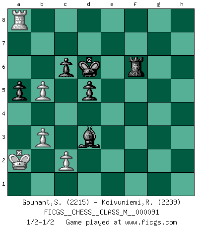 Last move : 1/2-1/2 2021 February 18 0:58:6 [Event "FICGS__CHESS__CLASS_M__000091"] [Site "FICGS"] [Date "2020.09.01"] [Round "1"] [White "Gounant,Stanislas"] [Black "Koivuniemi,Raimo"] [Result "1/2-1/2"] [WhiteElo "2215"] [BlackElo "2239"] 1.b3 e5 2.Bb2 d6 3.e3 g6 4.d4 Nd7 5.dxe5 Bg7 6.Nf3 Nxe5 7.Nc3 Nd7 8.Qd2 Ngf6 9.O-O-O Nc5 10.Nd4 O-O 11.f3 d5 12.g4 c6 13.h4 h5 14.Be2 Re8 15.gxh5 Nxh5 16.Rdg1 Qe7 17.Nd1 a5 18.a4 Ne6 19.Nxe6 Bxb2+ 20.Kxb2 Qxe6 21.Rg5 Ng3 22.Rg1 Nxe2 23.Qxe2 Qf6+ 24.Ka2 Re5 25.f4 Rf5 26.Qd2 Qe7 27.Nb2 Qe4 28.Qh2 b5 29.Rh1 Qxe3 30.h5 Qxf4 31.Qxf4 Rxf4 32.hxg6 Rf6 33.gxf7+ Kxf7 34.Rh7+ Ke6 35.Nd3 Kd6 36.Rg8 Bf5 37.Rxa8 Bxh7 38.axb5 Bxd3 1/2-1/2 Follow this game move after move (download)Good positions don't win games, good moves do. (Gerald Abrahams) Wie ich sie so einen nach dem anderen nieder mähte wurde meine Überlegenheit offensichtlich. (José Raúl Capablanca) Vive, pierde y aprende al observar a tu oponente como ganar. (Amber Steenbock) En blitz, le Cavalier l'emporte sur le Fou. (Vlastimil Hort) Indecision is the key to flexibility. (Unknown)
