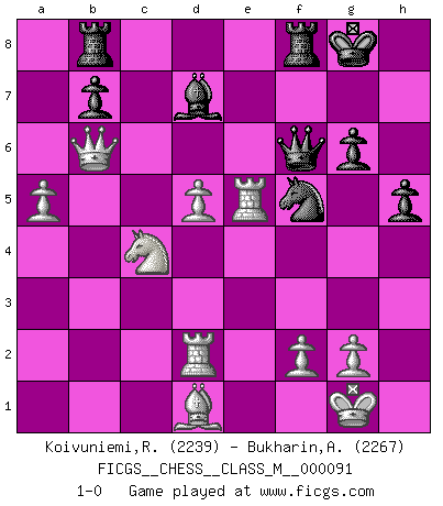 Last move : 1-0 2021 April 16 5:10:50 [Event "FICGS__CHESS__CLASS_M__000091"] [Site "FICGS"] [Date "2020.09.01"] [Round "1"] [White "Koivuniemi,Raimo"] [Black "Bukharin,Alexey"] [Result "1-0"] [WhiteElo "2239"] [BlackElo "2267"] 1.c4 Nf6 2.Nc3 g6 3.d4 Bg7 4.e4 d6 5.Nf3 O-O 6.Be2 e5 7.O-O Nc6 8.d5 Ne7 9.b4 Nh5 10.Re1 f5 11.a4 Nf6 12.a5 Nxe4 13.Nxe4 fxe4 14.Ng5 e3 15.Bxe3 Nf5 16.Bd2 Bh6 17.Qc1 Nd4 18.Bd1 Qe7 19.Ra3 Kh8 20.Be3 Nf5 21.Bd2 Nd4 22.h3 Kg8 23.c5 Rb8 24.Rd3 Qg7 25.Ne4 Bxd2 26.Rxd2 Qh6 27.cxd6 cxd6 28.Nxd6 Bxh3 29.Re3 Bd7 30.Qc7 Qg7 31.b5 h5 32.b6 axb6 33.Qxb6 Qf6 34.Nc4 Nf5 35.Rxe5 1-0 Follow this game move after move (download)My style is somewhere between that of Tal and Petrosian. (Reshevsky) Charakterschwächen offenbaren sich normalerweise während einer Schachpartie. (Garry Kasparov) Me siento como si fuera una pieza en una partida de Ajedrez, cuando mi oponente me indica: esa pieza no puede ser movida. (Soren Kierkegaard) Mon pion favori sur ma case favorite ! Bronstein en parlant d'un coup de pion en h5 quand il avait les Noirs. The message for business people contemplating their place in the cyberspace is simple and direct: get linked or get lost. (Vic Sussman and Kenan Pollack)