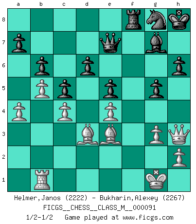 Last move : 1/2-1/2 2021 April 4 21:56:47 [Event "FICGS__CHESS__CLASS_M__000091"] [Site "FICGS"] [Date "2020.09.01"] [Round "1"] [White "Helmer,Janos"] [Black "Bukharin,Alexey"] [Result "1/2-1/2"] [WhiteElo "2222"] [BlackElo "2267"] 1.Nf3 Nf6 2.c4 g6 3.Nc3 Bg7 4.e4 d6 5.d4 O-O 6.Be2 e5 7.O-O Nc6 8.d5 Ne7 9.b4 Nh5 10.Re1 f5 11.Ng5 Nf6 12.f3 Kh8 13.Rb1 h6 14.Ne6 Bxe6 15.dxe6 fxe4 16.fxe4 Nc6 17.Nd5 Ng8 18.Bd3 Nd4 19.Qg4 g5 20.Qh3 c6 21.Ne3 Qf6 22.Nf5 Nxe6 23.g3 Nd4 24.Rf1 Qd8 25.Be3 Nxf5 26.Rxf5 Rxf5 27.Qxf5 b6 28.a4 c5 29.b5 Qe7 30.Qh3 Rf8 1/2-1/2 Follow this game move after move (download)Not all artists are Chess players, but all Chess players are artists. (Marcel Duchamp) Ich möchte Schüler heranbilden, die das Vermögen haben, selbst zu denken und Kritik zu üben. (Emanuel Lasker) Un entendimiento minucioso de las típicas continuaciones de mate hacen de las mas complicadas combinaciones de sacrificio que conducen hacia ellas no solo no dificiles, sino casi un asunto de rutina. (Siegbert Tarrasch) Une platitude souvent récitée à propos des Echecs est qu'une des choses les plus difficiles à réaliser est de gagner une position gagnante. Cela ne manque pas de sens mais, pour ma part, j'ai toujours trouvé plus difficile de gagner une position perdante. (Tim Krabbe) Always two there are. No more no less. A master, and an apprentice. (Master Yoda in Star Wars ep.1)
