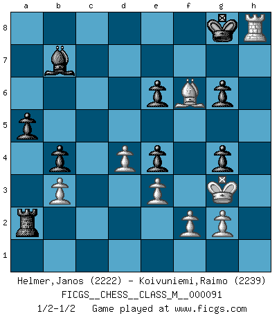 Last move : 1/2-1/2 2021 June 15 19:0:25 [Event "FICGS__CHESS__CLASS_M__000091"] [Site "FICGS"] [Date "2020.09.01"] [Round "1"] [White "Helmer,Janos"] [Black "Koivuniemi,Raimo"] [Result "1/2-1/2"] [WhiteElo "2222"] [BlackElo "2239"] 1.Nf3 d5 2.d4 Nf6 3.c4 c6 4.Nc3 Bf5 5.cxd5 cxd5 6.Qb3 Bc8 7.Bf4 Nc6 8.e3 e6 9.Be2 Be7 10.h3 O-O 11.O-O Na5 12.Qc2 Bd7 13.Bd3 a6 14.Rac1 Rc8 15.Qe2 Bc6 16.Ne5 Nd7 17.Rfd1 Nxe5 18.Bxe5 g6 19.Bf4 b5 20.b3 Qd7 21.Qf3 Nb7 22.Ne2 Nd6 23.Bh6 Rfd8 24.Nf4 b4 25.Qg3 Ne4 26.Bxe4 dxe4 27.h4 Qd6 28.Rc5 Bb7 29.Rxc8 Rxc8 30.Qg4 Qd8 31.h5 Bf6 32.Re1 a5 33.Kh2 Qe7 34.hxg6 hxg6 35.Rh1 Rc7 36.Nh5 Bh8 37.Bg5 f5 38.Bxe7 fxg4 39.Nf6+ Bxf6 40.Bxf6 Rc2 41.Kg3 Rxa2 42.Rh8+ 1/2-1/2 Follow this game move after move (download)Every Pawn is a potential Queen. (James Mason) Schach ist Kampf, hauptsächlich jedoch gegen die eigenen Fehler. (Savielly Grigorievitsch Tartakower) Todos los jugadores de Ajedrez deberían tener un pasatiempo. (Savielly Tartakower) Les Echecs sont affaire de jugement sensible. Savoir quand frapper et quand esquiver. (Fischer) A good teacher is like a candle - it consumes itself to light the way for others. (Author unknown)
