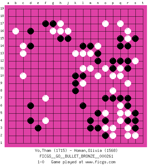 Last move : 1-0 2020 September 1 21:57:0 [Event "FICGS__GO__BULLET_BRONZE__000261 "] [Site "FICGS"] [Date "2020.09.01"] [Round "1"] [Black "Vo,Tham "] [White "Homan,Olivia "] [Result "1-0"] [Rating 1 "1715"] [Rating 2 "1568"] 1.k10 q17 2.q15 r15 3.r14 r16 4.q14 o17 5.d16 q4 6.d4 c10 7.r6 o3 8.r4 r3 9.s3 r5 10.s4 q6 11.s5 q5 12.r7 r2 13.q7 c14 14.f17 b16 15.m3 n14 16.o7 s12 17.s15 r9 18.q12 p8 19.p7 q11 20.p11 p10 21.r11 q10 22.r12 o11 23.p12 n10 24.l6 s2 25.o4 n4 26.n3 o5 27.o2 p3 28.n5 p2 29.m4 g16 30.d14 c13 31.g17 j16 32.e3 f4 33.d6 f7 34.k8 l9 35.k9 h17 36.h15 h16 37.n13 m13 38.n12 l11 39.m14 l13 40.l14 k13 41.l10 m11 42.j15 1-0 Here are the names of the openings (joseki) played in the four corners : Corner q16 : q17 q15Komoku (Somok, Xiao~mu`) 3-4 Point. The komoku (3-4) point is the traditional corner enclosure move..Ikken Takagakari (Hankan Nop'dakeolch'im, Yi Gaogua`jiao~, 1-Space High Approach). The 5-4 approach move has become more popular in modern times, as modern Go emphasizes speed and influence. Corner q4 : q4 r6Hoshi (Hwajeom, Seongjeom, Xingwei`) 4-4 Point. The star or hoshi (4-4) point, emphasizing influence at the potential expense of territory.Ikken Kakari (Hankan Keolch'im, Yi Gua`jiao~, 1-Space Low Approach). Black 2 is the standard approach move to the 4-4. Corner d16 : d16 c14Hoshi (Hwajeom, Seongjeom, Xingwei`) 4-4 Point. The star or hoshi (4-4) point, emphasizing influence at the potential expense of territory.Ikken Kakari (Hankan Keolch'im, Yi Gua`jiao~, 1-Space Low Approach). White 2 is the standard approach move to the 4-4. Player Black won this Go (weiqi, baduk) game.Follow this game move after move (download ) Keep away from thickness. (Anonymous) It's unlucky to be superstitious. (Dave Enteles)