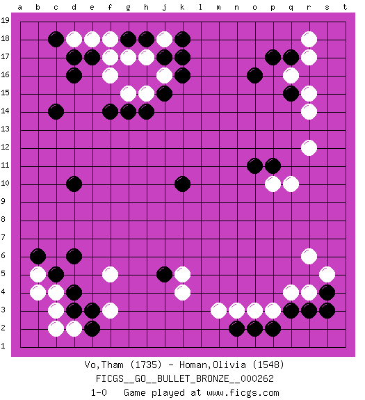 Last move : 1-0 2020 September 1 22:28:12 [Event "FICGS__GO__BULLET_BRONZE__000262"] [Site "FICGS"] [Date "2020.09.01"] [Round "1"] [Black "Vo,Tham"] [White "Homan,Olivia"] [Result "1-0"] [Rating 1 "1735"] [Rating 2 "1548"] 1.k10 q16 2.o16 r14 3.d4 q4 4.d16 f3 5.d6 k4 6.c14 q10 7.r3 r4 8.q3 p3 9.p2 o3 10.o2 n3 11.k17 c3 12.d3 c4 13.c5 d2 14.e2 c2 15.e3 b5 16.b6 b4 17.q17 r17 18.p17 r18 19.n2 m3 20.j5 k5 21.p11 p10 22.s4 s5 23.s3 r6 24.o11 r12 25.q15 r15 26.d10 e18 27.d17 h17 28.j15 f16 29.f14 g15 30.g14 h15 31.h14 j16 32.k16 f5 33.e17 f17 34.g18 d18 35.c18 f18 36.h18 j18 37.j17 g17 38.k18 1-0 Here are the names of the openings (joseki) played in the four corners : Corner q16 : q16 o16 Hoshi (Hwajeom, Seongjeom, Xingwei`) 4-4 Point. The star or hoshi (4-4) point, emphasizing influence at the potential expense of territory. Ikken Takagakari (Hankan Nop'dakeolch'im, Yi Gaojia, 1-Space High Approach). White typically responds at 6-4 or 3-10. White 4-10 is played when White finds play on the right side advantageous. White 4-8 or 3-8 may be played when White has support at top. Corner d4 : d4 f3 Hoshi (Hwajeom, Seongjeom, Xingwei`) 4-4 Point. The star or hoshi (4-4) point, emphasizing influence at the potential expense of territory. Ikken Kakari (Hankan Keolch'im, Yi Gua`jiao~, 1-Space Low Approach). White 2 is the standard approach move to the 4-4. Corner q4 : q4 r3 Hoshi (Hwajeom, Seongjeom, Xingwei`) 4-4 Point. The star or hoshi (4-4) point, emphasizing influence at the potential expense of territory. Player Black won this Go (weiqi, baduk) game. Follow this game move after move (download)To invade, need 20 points in open area; otherwise, keshi is best. (Yang Yilun, 7p) Nowadays, anyone who cannot speak English and is incapable of using the Internet is regarded as backward. (Al-Waleed bin Talal)