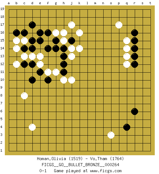 Last move : 0-1 2020 September 1 23:10:49 [Event "FICGS__GO__BULLET_BRONZE__000264 "] [Site "FICGS"] [Date "2020.09.01"] [Round "1"] [Black "Homan,Olivia "] [White "Vo,Tham "] [Result "0-1"] [Rating 1 "1519"] [Rating 2 "1764"] 1.r16 p17 2.q4 o3 3.r6 d4 4.d17 c15 5.e16 q15 6.r15 q14 7.r14 q13 8.r13 q12 9.r12 j17 10.c12 d13 11.d12 e13 12.c16 e12 13.d10 c8 14.e11 f11 15.f10 g11 16.j15 g16 17.g15 f15 18.f16 h15 19.g14 h16 20.h14 j14 21.h12 k14 22.f14 c13 23.h13 j13 24.h11 h10 25.e15 j10 26.d15 k16 27.c14 b15 28.b16 b14 29.d14 b12 0-1 Here are the names of the openings (joseki) played in the four corners : Corner q16 : r16 p17Komoku (Somok, Xiao~mu`) 3-4 Point. The komoku (3-4) point is the traditional corner enclosure move..Ikken Kakari (Hankan Keolch'im, Yi Gua`jiao~, 1-Space Low Pincer). The small knight move is the basic approach move to the 3-4 point stone. It has been continually used for over four centuries. There are limitless variations, with new moves constantly being discovered. White 2 opens the door to a treaure store of joseki. Corner q4 : q4 o3Hoshi (Hwajeom, Seongjeom, Xingwei`) 4-4 Point. The star or hoshi (4-4) point, emphasizing influence at the potential expense of territory.Ikken Kakari (Hankan Keolch'im, Yi Gua`jiao~, 1-Space Low Approach). White 2 is the standard approach move to the 4-4. Corner d16 : d17 c15Komoku (Somok, Xiao~mu`) 3-4 Point. The komoku (3-4) point is the traditional corner enclosure move..Ikken Kakari (Hankan Keolch'im, Yi Gua`jiao~, 1-Space Low Pincer). The small knight move is the basic approach move to the 3-4 point stone. It has been continually used for over four centuries. There are limitless variations, with new moves constantly being discovered. White 2 opens the door to a treaure store of joseki. Player White won this Go (weiqi, baduk) game.Follow this game move after move (download ) If you don't know ladders, don't play go. (Anonymous) We cannot be sure of having something to live for unless we are willing to die for it. (Ernesto Che Guevara)