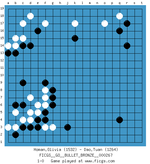 Last move : 1-0 2020 September 2 0:24:1 [Event "FICGS__GO__BULLET_BRONZE__000267 "] [Site "FICGS"] [Date "2020.09.02"] [Round "1"] [Black "Homan,Olivia "] [White "Dao,Tuan "] [Result "1-0"] [Rating 1 "1532"] [Rating 2 "1264"] 1.q16 c15 2.q4 c4 3.e16 c17 4.d14 d18 5.c14 f17 6.c9 b14 7.b13 a14 8.a13 b15 9.c6 f3 10.c3 d5 11.d3 d4 12.e3 b3 13.b2 b5 14.f4 g3 15.e4 a3 16.b6 e5 17.f5 e6 18.j3 k17 19.g7 o17 20.r14 q18 21.r17 f6 22.g6 f7 23.g8 f8 24.f9 d7 25.k15 1-0 Here are the names of the openings (joseki) played in the four corners : Corner d16 : c15 e16Mokuhazushi (Waemok, Wai`mu`) 5-3 Point. The mokuhazushi (5-3) point was popular in the Edo period in Japan (1600 - 1867). It emphasizes influence; territorially, it is inferior to the 3-4 point.Takamoku Kakari. Black prevents White from gaining influence, but in the local context, abandoning profit in the corner entails a loss. White 3-4 and 4-4 are best. Corner d4 : c4 c9Komoku (Somok, Xiao~mu`) 3-4 Point. The komoku (3-4) point is the traditional corner enclosure move.. Corner q16 : q16 o17Hoshi (Hwajeom, Seongjeom, Xingwei`) 4-4 Point. The star or hoshi (4-4) point, emphasizing influence at the potential expense of territory.Ikken Kakari (Hankan Keolch'im, Yi Gua`jiao~, 1-Space Low Approach). White 2 is the standard approach move to the 4-4. Player Black won this Go (weiqi, baduk) game.Follow this game move after move (download ) There is damezumari at the bamboo joint. (Anonymous) Empty your mind, be formless, shapeless — like water. (Bruce Lee)