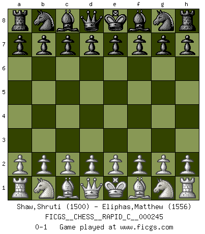 Last move : 0-1 2020 October 3 1:44:41 [Event "FICGS__CHESS__RAPID_C__000245"] [Site "FICGS"] [Date "2020.09.02"] [Round "1"] [White "Shaw,Shruti"] [Black "Eliphas,Matthew"] [Result "0-1"] [WhiteElo "1500"] [BlackElo "1556"] 0-1 This chess game has been lost on time (started : 2020.09.02 14:8:14) Player Black won this chess game. Follow this game move after move (download)One doesn't have to play well, it's enough to play better than your opponent. (Siegbert Tarrasch) Den Ruhm habe ich schon, jetzt brauche ich noch das Geld. (Wilhelm Steinitz) Solo los afeminados hacen el Enroque. (Rob Sillars) Votre seul travail dans les ouvertures est d'obtenir un milieu de partie jouable. (Lajos Portish) A proverb is a short sentence based on long experience. (Miguel de Cervantes)