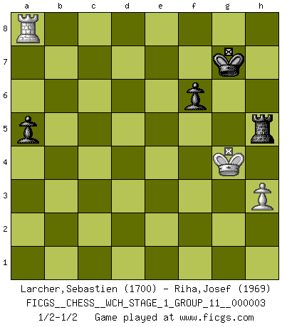 Last move : 1/2-1/2 2007 September 18 12:41:55 [Event "FICGS__CHESS__WCH_STAGE_1_GROUP_11__000003"] [Site "FICGS"] [Date "2007.07.11"] [Round "1"] [White "Larcher,Sebastien"] [Black "Riha,Josef"] [Result "1/2-1/2"] [WhiteElo "1700"] [BlackElo "1969"] 1.c4 Nf6 2.g3 e5 3.Bg2 d5 4.cxd5 Nxd5 5.Qb3 Nb6 6.Nc3 c5 7.d3 Be7 8.Be3 O-O 9.Rc1 Be6 10.Qb5 Bd7 11.Qb3 Nc6 12.Qd1 Rc8 13.Nf3 Be6 14.O-O f6 15.Nd2 Qd7 16.f4 exf4 17.Bxf4 Nd4 18.a4 Rcd8 19.a5 Nd5 20.Nxd5 Bxd5 21.Bxd5+ Qxd5 22.Nc4 f5 23.Rf2 Qe6 24.Ra1 Bf6 25.Bd2 Rd5 26.Ra3 Rfd8 27.Bc3 Bg5 28.Bd2 Be7 29.h3 Nb5 30.Rb3 Qc6 31.Ne3 Re5 32.Nc4 Re6 33.Qf1 Nd4 34.Rc3 Bf6 35.e3 Nb5 36.Rc1 Nd6 37.b4 cxb4 38.Bxb4 Nxc4 39.Rxc4 Qe8 40.Rxf5 Rxe3 41.Rxf6 gxf6 42.Rg4+ Kf7 43.Qf5 Re1+ 44.Bxe1 Qxe1+ 45.Kg2 Qd2+ 46.Kf1 Qxd3+ 47.Qxd3 Rxd3 48.Kg2 Rd5 49.Rb4 Rxa5 50.Rxb7+ Kg6 51.g4 h5 52.gxh5+ Kxh5 53.Kg3 Rg5+ 54.Kf4 a5 55.Ra7 Kg6 56.Ra8 Rh5 57.Rg8+ Kf7 58.Ra8 Kg7 59.Kg4 1/2-1/2 English, 1...Nf6 (Anglo-Indian defense) Kingside Castling by player Black (move 8) Kingside Castling by player White (move 14) 10 pieces endgame at move 49 : White KRPP , Black KRPPPP WHITE : King + 1 Rook 2 Pawns BLACK : King + 1 Rook 4 Pawns 9 pieces endgame at move 50 : White KRPP , Black KRPPP WHITE : King + 1 Rook 2 Pawns BLACK : King + 1 Rook 3 Pawns 8 pieces endgame at move 52 : White KRPP , Black KRPP WHITE : King + 1 Rook 2 Pawns BLACK : King + 1 Rook 2 Pawns 7 pieces endgame at move 52 : White KRP , Black KRPP WHITE : King + 1 Rook 1 Pawn BLACK : King + 1 Rook 2 Pawns This chess game ended in a draw. Follow this game move after move (download)We must make sure that Chess will not be like a dead language, very interesting, but for a very small group. (Sytze Faber) Je mehr wir mit Computern analysieren, desto mehr glauben wir an Verteidigung. (Vladimir Kramnik) El Rey es una pieza de pelea. ¡Usenlo!. (Wilhelm Steinitz) Plusieurs personnes se sont demandées comment Tal faisait pour gagner... En fait, c'est très simple ! Il met ses pièces au centre de l'échiquier et les sacrifie quelque part ! (David Bronstein) Chess is everything: art, science and sport. (Anatoly Karpov)