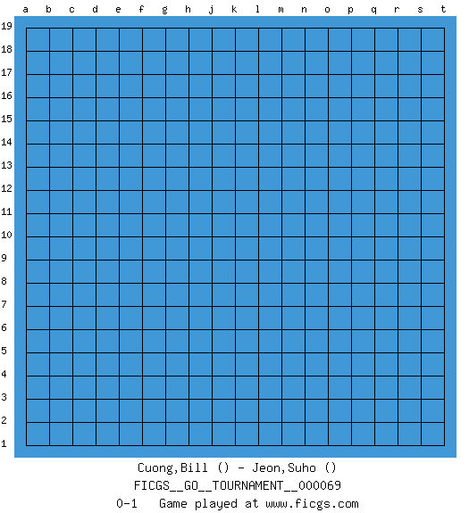 Last move : 0-1 2020 October 3 1:44:41 [Event "FICGS__GO__TOURNAMENT__000069"] [Site "FICGS"] [Date "2020.09.02"] [Round "1"] [Black "Cuong,Bill"] [White "Jeon,Suho"] [Result "0-1"] 0-1 This go game has been lost on time (started : 2020.09.02 14:14:58) Here are the names of the openings (joseki) played in the four corners : Player White won this Go (weiqi, baduk) game. Follow this game move after move (download)Go is not a blocking game, it's a game of action. (Pierre Audouard) Every vice is only an exaggeration of a necessary and virtuous function. (Ralph Waldo Emerson, Journals 1936)