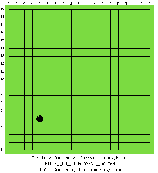 Last move : 1-0 2020 October 3 1:44:41 [Event "FICGS__GO__TOURNAMENT__000069"] [Site "FICGS"] [Date "2020.09.02"] [Round "1"] [Black "Martinez Camacho,Victor Hugo"] [White "Cuong,Bill"] [Result "1-0"] [Rating 1 "0765"] 1.e5 1-0 This go game has been lost on time (started : 2020.09.02 14:14:58) Here are the names of the openings (joseki) played in the four corners : Corner d4 : e5 1-0 Go-no-go (Wu~wu~) 5-5 Point. The 5-5 was experimented with briefly during the "New Fuseki" movement in Japan in the 1930s. The 5-5 point has not retained popularity because the 4-4 hoshi (star) point strikes a better balance between influence and territory. As one can see from the variations, though, the 5-5 is playable. Player Black won this Go (weiqi, baduk) game. Follow this game move after move (download)The carpenter's square becomes ko. (Anonymous) Faith : not wanting to know what is true. (Friedrich Nietzsche)