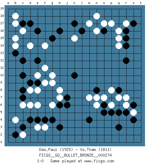 Last move : 1-0 2020 September 2 22:17:3 [Event "FICGS__GO__BULLET_BRONZE__000274 "] [Site "FICGS"] [Date "2020.09.02"] [Round "1"] [Black "Dao,Paul "] [White "Vo,Tham "] [Result "1-0"] [Rating 1 "1925"] [Rating 2 "1811"] 1.k10 q16 2.o16 q14 3.r12 o17 4.n17 p17 5.d4 c16 6.q3 c6 7.e16 d14 8.c17 b17 9.d17 b18 10.e12 f14 11.h16 n18 12.c12 b14 13.c8 e6 14.g4 b4 15.c3 d8 16.d9 e8 17.c7 d6 18.r15 q15 19.r14 m17 20.h3 h7 21.q5 r7 22.q8 p6 23.j7 q7 24.h6 h8 25.p5 n6 26.o5 m7 27.o6 o7 28.n8 n7 29.m4 p8 30.e9 g6 31.j6 f9 32.f10 g9 33.r16 s5 34.k17 r17 35.s17 k15 36.l16 n16 37.g15 g10 38.s6 r6 39.s4 f11 40.c10 e10 41.b13 b15 42.r5 e3 43.e4 f3 44.f4 c2 45.b2 1-0 Here are the names of the openings (joseki) played in the four corners : Corner q16 : q16 o16Hoshi (Hwajeom, Seongjeom, Xingwei`) 4-4 Point. The star or hoshi (4-4) point, emphasizing influence at the potential expense of territory.Ikken Takagakari (Hankan Nop'dakeolch'im, Yi Gaojia, 1-Space High Approach). White typically responds at 6-4 or 3-10. White 4-10 is played when White finds play on the right side advantageous. White 4-8 or 3-8 may be played when White has support at top. Corner d4 : d4 c6Hoshi (Hwajeom, Seongjeom, Xingwei`) 4-4 Point. The star or hoshi (4-4) point, emphasizing influence at the potential expense of territory.Ikken Kakari (Hankan Keolch'im, Yi Gua`jiao~, 1-Space Low Approach). White 2 is the standard approach move to the 4-4. Corner d16 : c16 e16Komoku (Somok, Xiao~mu`) 3-4 Point. The komoku (3-4) point is the traditional corner enclosure move..Ikken Takagakari (Hankan Nop'dakeolch'im, Yi Gaogua`jiao~, 1-Space High Approach). The 5-4 approach move has become more popular in modern times, as modern Go emphasizes speed and influence. Player Black won this Go (weiqi, baduk) game.Follow this game move after move (download ) Conservative and slow will win. Believe it ! (Anonymous) Life is the sum of all your choices. (Albert Camus)