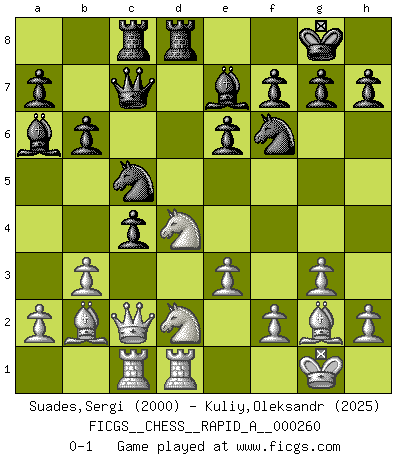 Last move : 0-1 2020 November 8 20:4:44 [Event "FICGS__CHESS__RAPID_A__000260"] [Site "FICGS"] [Date "2020.09.03"] [Round "1"] [White "Suades,Sergi"] [Black "Kuliy,Oleksandr"] [Result "0-1"] [WhiteElo "2000"] [BlackElo "2025"] 1.d4 d5 2.c4 e6 3.Nf3 Nf6 4.g3 Be7 5.Bg2 O-O 6.O-O Nbd7 7.Qc2 c6 8.Rd1 b6 9.b3 Ba6 10.Bb2 Rc8 11.e3 Qc7 12.Nbd2 c5 13.Rac1 Rfd8 14.dxc5 Nxc5 15.Nd4 dxc4 0-1 This chess game has been lost on time (started : 2020.09.03 1:54:49) Follow this game move after move (download)No one ever won a game by resigning. (Unknown) Ich bin Weltmeister und muß mit niemandem irgend etwas diskutieren. (Viswanathan Anand) Por la belleza de sus partidas, la claridad de su juego y lo brillante de sus ideas, Fischer se creó el mismo como un artista de la misma estatura como Brahms, Rembrandt y Shakespeare. (David Levy) Les sacrifices démontrent seulement que quelqu'un a gaffé. (Savielly Tartacover) How many people work in NATO Headquarters ? - About half of them. (Dirk Stikker, NATO general secretary)