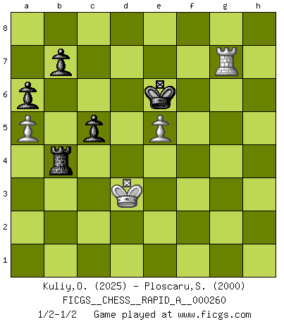 Last move : 1/2-1/2 2020 December 1 19:52:55 [Event "FICGS__CHESS__RAPID_A__000260"] [Site "FICGS"] [Date "2020.09.03"] [Round "1"] [White "Kuliy,Oleksandr"] [Black "Ploscaru,Stelian"] [Result "1/2-1/2"] [WhiteElo "2025"] [BlackElo "2000"] 1.e4 c5 2.Nf3 d6 3.d4 cxd4 4.Nxd4 Nf6 5.Nc3 a6 6.Be2 e5 7.Nb3 Be7 8.Be3 Be6 9.O-O O-O 10.Qd2 Nbd7 11.a4 Rc8 12.a5 Qc7 13.Rfc1 h6 14.f3 Rfe8 15.Nd5 Nxd5 16.exd5 Bf5 17.c4 Qd8 18.Rc3 Bf6 19.h3 Bg6 20.Rd1 e4 21.f4 Bxc3 22.Qxc3 Bh7 23.Rf1 Qe7 24.Kh2 Rc7 25.Bd4 f5 26.Qe3 Nf6 27.Rg1 Qf7 28.Bb6 R7c8 29.Nd4 Nd7 30.Ba7 Nc5 31.g4 Qf6 32.gxf5 Re7 33.Ne6 Bxf5 34.Bxc5 dxc5 35.Bg4 Qxb2+ 36.Rg2 Qf6 37.Bxf5 Qxf5 38.Qc3 g6 39.Qe5 Qxe5 40.fxe5 g5 41.h4 Rxe6 42.dxe6 Kf8 43.hxg5 hxg5 44.Kg1 Ke7 45.Kf2 Rg8 46.Ke3 Kxe6 47.Kxe4 Rd8 48.Rxg5 Rd4+ 49.Ke3 Rxc4 50.Kd3 Ra4 51.Rg7 Rb4 1/2-1/2 Follow this game move after move (download)Chess is a terrible game. If you have no center, your opponent has a freer position. If you do have a center, then you really have something to worry about ! (Siegbert Tarrasch) Rubinstein ist ein Turmendspiel, welches die Götter vor tausenden von Jahren begannen. (Savielly Grigorievitsch Tartakower) Nada excita más a Grandes Maestros aburridos que una novedad teórica. (Dominic Lawson) Vous n'êtes pas toujours obligé de jouer le meilleur coup. Un coup doit être actif, entreprenant, correct et beau ! (David Bronstein) If you lose the game you should win the analysis! (Proverb)