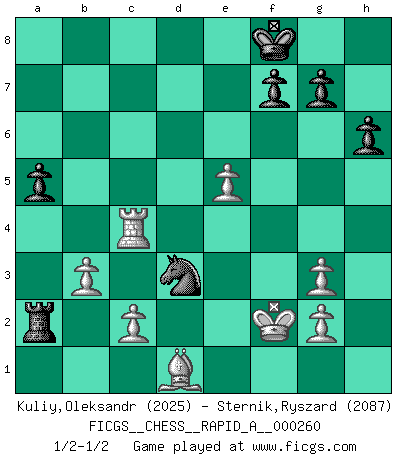 Last move : 1/2-1/2 2020 November 11 14:35:30 [Event "FICGS__CHESS__RAPID_A__000260"] [Site "FICGS"] [Date "2020.09.03"] [Round "1"] [White "Kuliy,Oleksandr"] [Black "Sternik,Ryszard"] [Result "1/2-1/2"] [WhiteElo "2025"] [BlackElo "2087"] 1.e4 c5 2.Nf3 e6 3.d4 cxd4 4.Nxd4 Nf6 5.Nc3 Nc6 6.Be2 d6 7.Be3 Be7 8.O-O O-O 9.f4 e5 10.Nxc6 bxc6 11.Kh1 Re8 12.Bf3 exf4 13.Bxf4 Ba6 14.Re1 Qb6 15.Na4 Qa5 16.b3 Nd7 17.Bxd6 Bh4 18.Bg3 Bxg3 19.hxg3 Rad8 20.Qd4 Qg5 21.Qf2 Bb5 22.Nb2 Ne5 23.Rad1 c5 24.Kg1 h6 25.Rd5 Rd7 26.Bd1 Re6 27.Rxd7 Bxd7 28.Qe3 Ra6 29.Nd3 Qe7 30.Qxc5 Qxc5+ 31.Nxc5 Rxa2 32.Nxd7 Nxd7 33.Kf2 a5 34.e5 Kf8 35.Re4 Nc5 36.Rc4 Nd3+ 1/2-1/2 Follow this game move after move (download)A man that will take back a move at Chess will pick a pocket. (Richard Fenton) Wenn ich Weiß habe gewinne ich weil ich Weiß habe, wenn ich Schwarz habe gewinne ich weil ich Bogoljubov bin. (Efim Bogoljubov) Yo no le temo a Spassky. Todos saben que yo soy el mejor. Uno no necesita un torneo para probarlo. (Bobby Fischer) Même si vous avez un bon coup à faire, regardez toujours s'il n'y en a pas un qui lui soit préférable. (Pedro Damiano) CHESS, n. f. [echecs, Fr.] A nice and abstruse game, in which two sets of puppets are moved in opposition to each other. (Dr Samuel Johnson, A Dictionary Of The English Language, 1755)