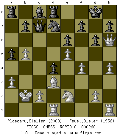 Last move : 1-0 2020 November 3 15:37:28 [Event "FICGS__CHESS__RAPID_A__000260"] [Site "FICGS"] [Date "2020.09.03"] [Round "1"] [White "Ploscaru,Stelian"] [Black "Faust,Dieter"] [Result "1-0"] [WhiteElo "2000"] [BlackElo "1956"] 1.e4 c5 2.Nf3 Nc6 3.d4 cxd4 4.Nxd4 e6 5.Nc3 a6 6.Be3 Nf6 7.a3 Be7 8.f4 d5 9.e5 Nd7 10.Qh5 Nxd4 11.Bxd4 Bc5 12.O-O-O O-O 13.Bxc5 Nxc5 14.b4 Nd7 15.Bd3 g6 16.Qh6 Qc7 17.Kb2 d4 18.Ne2 a5 19.b5 Rd8 20.h4 1-0 Sicilian defense Queenside Castling by player White (move 12) Kingside Castling by player Black (move 12) Player White won this chess game. Follow this game move after move (download)A good sacrifice is one that is not necessarily sound but leaves your opponent dazed and confused. (Rudolph Spielmann) Frage des Reporters: -Worin besteht das Ziel von Gambiteröffnungen? Antwort: -Auf Kosten der Partie einen Ruf als Angriffspieler zu erwerben.- (Siegbert Tarrasch) Al jugar al Ajedrez entonces, podemos aprender: Primero: Previsión... Segundo: Prudencia... Tercero: Cautela... Y al final, aprendemos del Ajedrez el hábito de no ser desanimados por apariencias malas presentes en el estado de nuestros asuntos, el hábito de la esperanza por una oportunidad favorable y la perseveración de los secretos de los recursos. (Benjamin Franklin) La guerre est enfant de la passion, la passion est enfant du narcissisme et le narcissisme est l'enfant. (...) Une autre partie ? (Thibault de Vassal) It's unlucky to be superstitious. (Dave Enteles)
