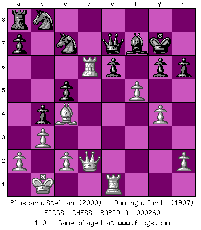 Last move : 1-0 2020 December 16 16:54:17 [Event "FICGS__CHESS__RAPID_A__000260"] [Site "FICGS"] [Date "2020.09.03"] [Round "1"] [White "Ploscaru,Stelian"] [Black "Domingo,Jordi"] [Result "1-0"] [WhiteElo "2000"] [BlackElo "1907"] 1.e4 e5 2.Nf3 d6 3.d4 exd4 4.Nxd4 Nf6 5.Nc3 Be7 6.Bf4 O-O 7.Qd2 c6 8.O-O-O b5 9.f3 b4 10.Na4 Bd7 11.g4 c5 12.Nf5 Bxa4 13.Nxe7+ Qxe7 14.Bxd6 Qb7 15.Bxf8 Kxf8 16.e5 Ne8 17.e6 fxe6 18.Bc4 Qe7 19.Rhe1 Nc7 20.Qf4+ Kg8 21.b3 Be8 22.Rd6 Bf7 23.Qd2 g6 24.f4 Kg7 25.f5 h6 26.Kb1 1-0 Follow this game move after move (download)The King is a fighting piece. Use it ! (Wilhelm Steinitz) Ein Teil des Fehlers ist immer korrekt. (Savielly Grigorievitsch Tartakower) El Ajedrez moderno está demasiado preocupado con cosas como la estructura de Peones. Olvidenlo, el Jaque Mate termina la partida. (Nigel Short) Seul un grand joueur sait à quel point il joue faiblement. (Xavier Tartacover) No enterprise is more likely to succeed than one concealed from the enemy until it is ripe for execution. (Niccolo Machiavelli)