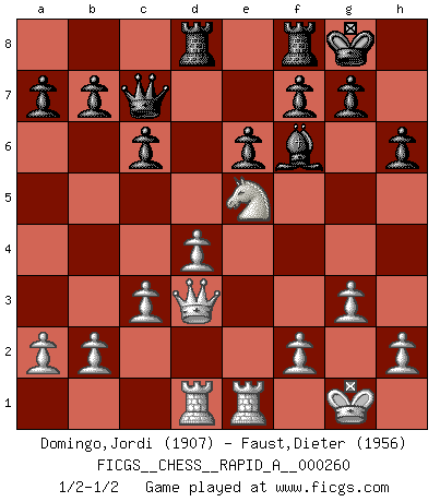 Last move : 1/2-1/2 2020 November 8 14:34:14 [Event "FICGS__CHESS__RAPID_A__000260"] [Site "FICGS"] [Date "2020.09.03"] [Round "1"] [White "Domingo,Jordi"] [Black "Faust,Dieter"] [Result "1/2-1/2"] [WhiteElo "1907"] [BlackElo "1956"] 1.e4 d5 2.exd5 Qxd5 3.Nf3 Qd8 4.Nc3 Bf5 5.d4 e6 6.Bd3 Bxd3 7.Qxd3 c6 8.O-O Nf6 9.Bg5 Nbd7 10.Rfe1 Be7 11.Rad1 h6 12.Bxf6 Nxf6 13.Ne5 Qc7 14.Ne4 O-O 15.c3 Rad8 16.Nxf6+ Bxf6 17.g3 1/2-1/2 Follow this game move after move (download)Chess is a terrible game. If you have no center, your opponent has a freer position. If you do have a center, then you really have something to worry about ! (Siegbert Tarrasch) Ich würde die 30 stärksten Spieler der USA im Simultanspiel besiegen. (José Raúl Capablanca) Morphy probablemente fue el genio más grande de todos. (Bobby Fischer) Ce qui est bien, c'est d'avoir tout un tas de pièces en prise : l'adversaire ne peut en prendre qu'une à la fois. Cité par Thierry Audin. Creativity is inventing, experimenting, growing, taking risks, breaking rules, making mistakes, and having fun. (Mary Lou Cook)