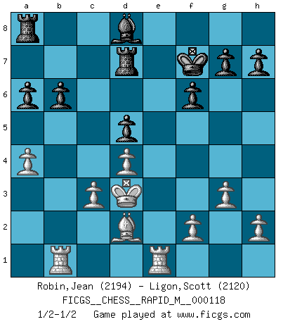 Last move : 1/2-1/2 2020 October 4 22:33:23 [Event "FICGS__CHESS__RAPID_M__000118"] [Site "FICGS"] [Date "2020.09.05"] [Round "1"] [White "Robin,Jean"] [Black "Ligon,Scott"] [Result "1/2-1/2"] [WhiteElo "2194"] [BlackElo "2120"] 1.e4 e5 2.Nf3 Nf6 3.Nxe5 d6 4.Nf3 Nxe4 5.d4 d5 6.Bd3 Bd6 7.O-O O-O 8.c4 c6 9.Re1 Bf5 10.Qb3 Qd7 11.Nc3 Nxc3 12.Bxf5 Qxf5 13.bxc3 b6 14.cxd5 cxd5 15.Qb5 Qd7 16.Rb1 Rd8 17.a4 Nc6 18.g3 Be7 19.Ne5 Nxe5 20.Rxe5 Bf6 21.Qxd7 Rxd7 22.Rf5 Rc8 23.Bd2 Be7 24.Rb5 Rcd8 25.Re5 f6 26.Re1 Ra8 27.Kf1 Kf7 28.Ke2 Bd8 29.Kd3 a6 30.R5b1 1/2-1/2 Petrov : Classical attack, Marshall variation Kingside Castling by player White (move 7) Kingside Castling by player Black (move 7) This chess game ended in a draw. Follow this game move after move (download)One of these modest little moves may be more embarrassing to your opponent than the biggest threat. (Siegbert Tarrasch) Die Jungen erwarten, dass Opa einfach umfällt. Dann aber kann Opa fünf Stunden lang Schach spielen und die jungen Gegner an die Wand drücken. (Viktor Kortschnoi) El jugador de combinación piensa hacia adelante; comienza de la posición dada y trabaja las movidas contundentes en su mente. (Emanuel Lasker) Vous n'êtes pas toujours obligé de jouer le meilleur coup. Un coup doit être actif, entreprenant, correct et beau ! (David Bronstein) Opportunities multiply as they are seized. (Sun Tzu)