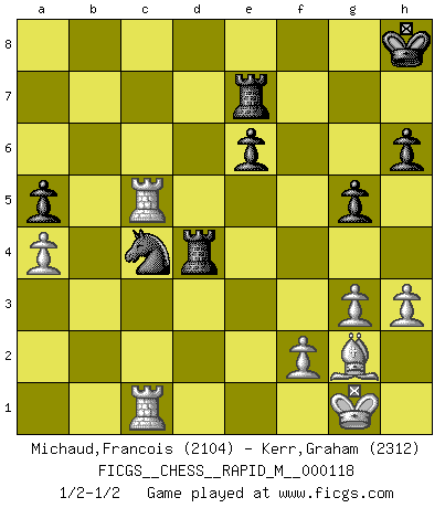 Last move : 1/2-1/2 2020 October 27 1:1:47 [Event "FICGS__CHESS__RAPID_M__000118"] [Site "FICGS"] [Date "2020.09.05"] [Round "1"] [White "Michaud,Francois"] [Black "Kerr,Graham"] [Result "1/2-1/2"] [WhiteElo "2104"] [BlackElo "2312"] 1.d4 d5 2.c4 c6 3.Nf3 Nf6 4.e3 e6 5.b3 b6 6.Bd3 Bd6 7.Nc3 O-O 8.Bb2 Bb7 9.O-O Nbd7 10.Qc2 Re8 11.Rfd1 Qe7 12.a4 a5 13.h3 h6 14.cxd5 Nxd5 15.Bc4 Nxc3 16.Bxc3 Rec8 17.Bd3 Nf6 18.e4 Nd7 19.e5 Bb4 20.Bxb4 Qxb4 21.Bh7+ Kh8 22.Be4 Ba6 23.Rac1 Rc7 24.Qd2 Qxd2 25.Nxd2 Rac8 26.Nc4 Bxc4 27.bxc4 g5 28.g3 c5 29.d5 Nxe5 30.dxe6 fxe6 31.Rd6 Re7 32.Rxb6 Rd8 33.Rb5 Rd4 34.Bg2 Nxc4 35.Rxc5 1/2-1/2 QGD Slav : 4.e3 Kingside Castling by player Black (move 7) Kingside Castling by player White (move 9) This chess game ended in a draw. Follow this game move after move (download)All that matters on the Chessboard is good moves. (Bobby Fischer) Je mehr ich von der FIDE weiss, um so weniger verstehe ich. (Alexander Kalifman) Para mi, el Ajedrez es la vida y cada partida es como una nueva vida. Todo jugador de Ajedrez suele vivir muchas vidas durante su vida. (Eduard Gufeld) Demandez au pauvre Cg1 ce qu'il en pense. Eduard Gufeld à propos de la variante Saemisch de l'Est-Indienne. The difference between stupidity and genius is that genius has its limits. (Murphy)