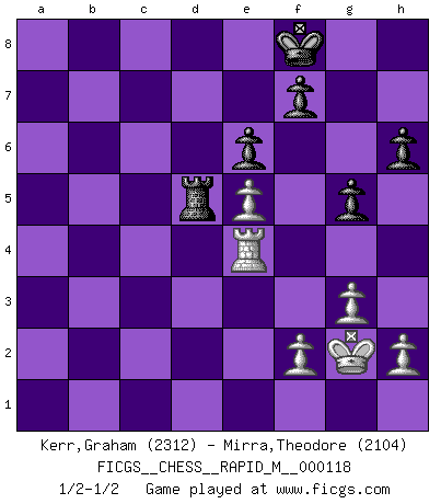 Last move : 1/2-1/2 2020 October 8 14:9:40 [Event "FICGS__CHESS__RAPID_M__000118"] [Site "FICGS"] [Date "2020.09.05"] [Round "1"] [White "Kerr,Graham"] [Black "Mirra,Theodore"] [Result "1/2-1/2"] [WhiteElo "2312"] [BlackElo "2104"] 1.d4 Nf6 2.c4 e6 3.Nf3 d5 4.Nc3 c6 5.g3 dxc4 6.Bg2 Nbd7 7.O-O b5 8.e4 Bb7 9.a4 b4 10.e5 Nd5 11.Ne4 Be7 12.Bg5 O-O 13.Bxe7 Qxe7 14.Rc1 c5 15.Re1 c3 16.bxc3 bxc3 17.Nd6 Rab8 18.dxc5 Nxc5 19.Nd4 Qd7 20.N4b5 a6 21.Nxb7 Rxb7 22.Nxc3 Nxc3 23.Rxc3 Qxd1 24.Rxd1 Nxa4 25.Bxb7 Nxc3 26.Ra1 g5 27.Rxa6 Kg7 28.Bf3 Rd8 29.Kg2 Nd5 30.Ra7 Kf8 31.Be4 h6 32.Ra4 Nb6 33.Rb4 Nd5 34.Bxd5 Rxd5 35.Re4 1/2-1/2 Graham Kerr gg, thanks ;-) Theodore Mirra Yes it was, thank you as well. Queen's pawn game Kingside Castling by player White (move 7) Kingside Castling by player Black (move 12) This chess game ended in a draw. Follow this game move after move (download)Capture of the adverse King is the ultimate but not the first object of the game. (William Steinitz) Schach ist Krieg, im Schach geht es um testosterongesteuerte Urschreie. (Garry Kasparov) En el Ajedrez, cuando menos, el valiente hereda la tierra. (Edmar Mednis) Les Echecs sont affaire de jugement sensible. Savoir quand frapper et quand esquiver. (Fischer) Warrior pose battles inner weakness and wins focus. You see that there is no war within you. You're on your own side, and you are your own strength. (Terri Guillemets)