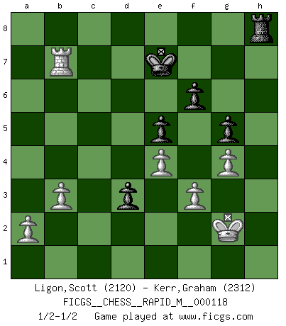Last move : 1/2-1/2 2020 October 27 2:23:12 [Event "FICGS__CHESS__RAPID_M__000118"] [Site "FICGS"] [Date "2020.09.05"] [Round "1"] [White "Ligon,Scott"] [Black "Kerr,Graham"] [Result "1/2-1/2"] [WhiteElo "2120"] [BlackElo "2312"] 1.e4 c5 2.Nf3 d6 3.Bb5+ Bd7 4.Bxd7+ Nxd7 5.O-O Ngf6 6.Qe2 e6 7.d4 cxd4 8.Nxd4 Qa5 9.Rd1 Rc8 10.c4 a6 11.b3 Be7 12.Bb2 Qh5 13.Qxh5 Nxh5 14.f3 Nhf6 15.Nc3 g5 16.Rd2 h5 17.Rad1 Ne5 18.Kf2 h4 19.Nde2 Nfd7 20.Na4 h3 21.g4 b5 22.cxb5 axb5 23.Nac3 Rb8 24.Nd4 b4 25.Nce2 Bf6 26.Ba1 Ke7 27.Nc2 Rb5 28.Ne3 Ra5 29.Bd4 Rc8 30.Kg3 Nb8 31.Bxe5 Bxe5+ 32.Kxh3 Rh8+ 33.Kg2 Rxh2+ 34.Kg1 Rh8 35.Nc4 Ra6 36.Nxe5 dxe5 37.Rc1 Rc6 38.Rxc6 Nxc6 39.Kg2 f6 40.Rc2 Nd4 41.Nxd4 exd4 42.Rc4 e5 43.Rxb4 d3 44.Rb7+ 1/2-1/2 Sicilian : Canal-Sokolsky attack, 3...Bd7 Kingside Castling by player White (move 5) This chess game ended in a draw. Follow this game move after move (download)Chess mastery essentially consists of analyzing Chess positions accurately. (Mikhail Botvinnik) Aljechin war kein Nazi. Er war ein Opportunist. Ein schrecklicher Mann. Er liebte Geld über alles und würde für Geld ein Jude, ein Katolik oder ein Protestant werden. (Miguel Najdorf) Una clavada es mas poderosa que una espada. (Fred Reinfeld) Karpov est une pièce de musée. (Garry Kasparov) It is the aim of the modern school, not to treat every position according to one general law, but according to the principle inherent in the position. (Richard Reti)