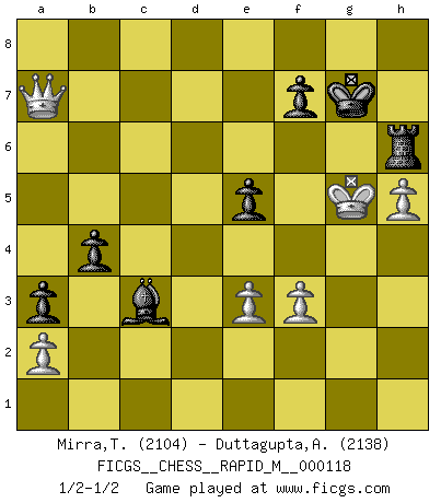 Last move : 1/2-1/2 2021 January 13 20:43:58 [Event "FICGS__CHESS__RAPID_M__000118"] [Site "FICGS"] [Date "2020.09.05"] [Round "1"] [White "Mirra,Theodore"] [Black "Duttagupta,Aniruddha"] [Result "1/2-1/2"] [WhiteElo "2104"] [BlackElo "2138"] 1.Nf3 Nf6 2.c4 c5 3.Nc3 e6 4.g3 b6 5.Bg2 Bb7 6.O-O Be7 7.d4 cxd4 8.Qxd4 O-O 9.Rd1 d6 10.Bg5 Nc6 11.Qf4 Qb8 12.Nb5 Ne5 13.Bxf6 Bxf6 14.Nxd6 Nxf3+ 15.Bxf3 Bxf3 16.Qxf3 Bxb2 17.Rab1 Be5 18.c5 Qc7 19.Qe4 Qxc5 20.Rbc1 Bxd6 21.Rxc5 Bxc5 22.Rd7 a5 23.Qd3 a4 24.h4 h5 25.Kg2 a3 26.Qd2 Ra4 27.Qg5 g6 28.f3 Rb4 29.g4 Rb1 30.Qf4 Ra1 31.gxh5 Rg1+ 32.Kh2 gxh5 33.Qe4 Bf2 34.e3 Rg6 35.Qd4 Kh7 36.Qb4 Kg7 37.Rb7 Rc8 38.Qd4+ Kg8 39.Rd7 b5 40.Rd8+ Rxd8 41.Qxd8+ Kg7 42.Qd4+ Kg8 43.Qe4 Rg3 44.Qe5 b4 45.Qa5 Kg7 46.Qxh5 Be1 47.Qe5+ Kg8 48.Qb8+ Kg7 49.Qb5 Rg6 50.h5 Rh6 51.Kh3 Bc3 52.Kg4 e5 53.Qc4 Rf6 54.Qd5 Rb6 55.Kg5 Rf6 56.Qb7 Rd6 57.Qe7 Rh6 58.Qa7 1/2-1/2 Follow this game move after move (download)You may learn much more from a game you lose than from a game you win. You will have to lose hundreds of games before becoming a good player. (Jose Raul Capablanca) Ich las kürzlich ein Buch von Nietzsche. Er sagte Religion verdumme nur die Menschen. Ich stimme zu. (Robert James Fischer) Cuando le juegas a Fischer, no es una cuestion de si vas a ganar o perder. Es una cuestion de si vas a sobrevivir. (Boris Spassky) Même un GMI sait rarement calculer sur plus de cinq coups une attaque à sacrifices. (Rudolf Spielmann) Fear is the path to the dark side. Fear leads to anger; anger leads to hate; hate leads to suffering. I sense much fear in you. (Master Yoda in Star Wars ep.1)