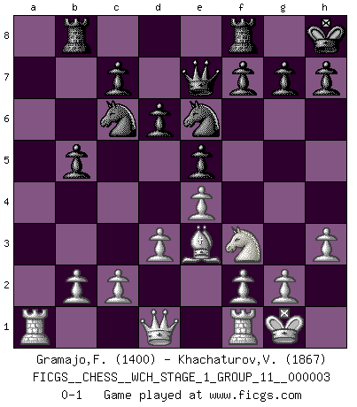 Last move : 0-1 2007 September 26 10:4:10 [Event "FICGS__CHESS__WCH_STAGE_1_GROUP_11__000003"] [Site "FICGS"] [Date "2007.07.11"] [Round "1"] [White "Gramajo,Francisco"] [Black "Khachaturov,Vadim"] [Result "0-1"] [WhiteElo "1400"] [BlackElo "1867"] 1.e4 e5 2.Nf3 Nc6 3.Bb5 a6 4.Ba4 Nf6 5.d3 b5 6.Bb3 Be7 7.Nc3 d6 8.a4 Rb8 9.axb5 axb5 10.O-O O-O 11.h3 Nd7 12.Nd5 Nc5 13.Ba2 Be6 14.Be3 Kh8 15.Nxe7 Qxe7 16.Bxe6 Nxe6 0-1 This chess game has been lost on time (started : 2007.07.11 17:6:20) Ruy Lopez : Anderssen variation Kingside Castling by player White (move 10) Kingside Castling by player Black (move 10) Player Black won this chess game. Follow this game move after move (download)It's just you and your opponent at the board and you're trying to prove something. (Bobby Fischer) Ich war schon mal beim Dopingtest. Da musste ich Urin abgeben, während Dritte zusahen. (Elisabeth Pähtz) Fischer deseaba darle a los Rusos una sopa de su propia medicina. (Larry Evans) Le moment que je préfère le plus dans une rencontre, c'est celui où je sens que la personnalité de l'adversaire se brise. (Robert Fischer) It's not the size of the dog in the fight, it's the size of the fight in the dog. (Mark Twain)