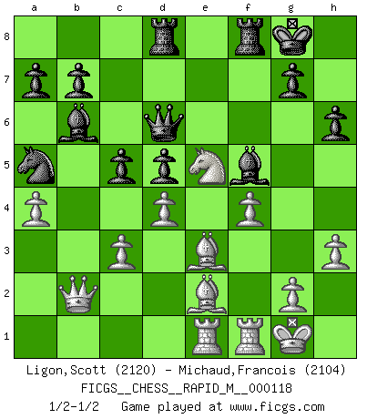 Last move : 1/2-1/2 2020 September 24 22:55:59 [Event "FICGS__CHESS__RAPID_M__000118"] [Site "FICGS"] [Date "2020.09.05"] [Round "1"] [White "Ligon,Scott"] [Black "Michaud,Francois"] [Result "1/2-1/2"] [WhiteElo "2120"] [BlackElo "2104"] 1.e4 e5 2.Nf3 Nc6 3.Bc4 Bc5 4.c3 Nf6 5.d4 exd4 6.e5 d5 7.Bb5 Ne4 8.cxd4 Bb6 9.Nc3 O-O 10.Be3 Bg4 11.h3 Bh5 12.Qc2 Nxc3 13.bxc3 f6 14.exf6 Qxf6 15.Be2 Bg6 16.Qb3 Qe6 17.a4 h6 18.O-O Be4 19.Rae1 Rad8 20.Qd1 Ba5 21.Bd2 Qf6 22.Nh2 Qg6 23.Ng4 Bb6 24.f3 Bc2 25.Qa1 Na5 26.Ne5 Qd6 27.Qb2 Bf5 28.f4 c5 29.Be3 1/2-1/2 Giuoco Piano Kingside Castling by player Black (move 9) Kingside Castling by player White (move 18) This chess game ended in a draw. Follow this game move after move (download)If your opponent offers you a draw, try to work out why he thinks he's worse off. (Nigel Short) Das Zentrum ist der Balkan des Schachbretts - Kriegshandlungen können in jedem Moment ausbrechen. (Aaron Nimzowitsch) Aún el Rey más flojo huye despavorido ante la amenaza de un Jaque doble. (Aaron Nimzowitsch) Nous sommes les pions de la mystérieuse partie d'Echecs jouée par Dieu. Il nous déplace, nous arrête, nous pousse encore, puis nous lance un à un dans la boîte du Néant. Epitaphe sur la tombe de David Janowsky (1868-1927). After growing wildly for years, the field of computing appears to be reaching its infancy. (John Pierce)
