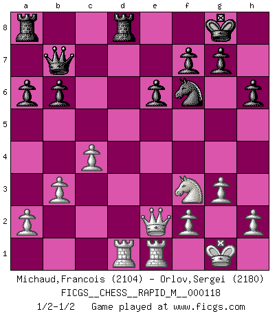Last move : 1/2-1/2 2020 September 11 9:28:26 [Event "FICGS__CHESS__RAPID_M__000118"] [Site "FICGS"] [Date "2020.09.05"] [Round "1"] [White "Michaud,Francois"] [Black "Orlov,Vladimir"] [Result "1/2-1/2"] [WhiteElo "2104"] [BlackElo "2180"] 1.d4 Nf6 2.c4 e6 3.Nf3 b6 4.g3 Ba6 5.b3 Bb4+ 6.Bd2 Be7 7.Bg2 c6 8.Bc3 d5 9.O-O Nbd7 10.Nbd2 O-O 11.Re1 Bb7 12.e4 dxe4 13.Nxe4 c5 14.Nfg5 cxd4 15.Bxd4 Qc7 16.Nxf6+ Bxf6 17.Bxb7 Qxb7 18.Bxf6 Nxf6 19.Qe2 h6 20.Nf3 Rfd8 21.Rad1 a6 1/2-1/2 Queen's Indian : Nimzovich variation (exaggerated Fianchetto) Kingside Castling by player White (move 9) Kingside Castling by player Black (move 10) This chess game ended in a draw. Follow this game move after move (download)By this measure (on the gap between Fischer & his contemporaries), I consider him the greatest world champion. (Garry Kasparov) Wer mein Gambit spielt, muß bereit sein, alle Brücken hinter sich abzubrechen. Es verändert den ganzen Menschen. Es wirkt wie ein Zauberstab und fördert verkümmerte, gute Charakter- eigenschaften wieder zu Tage. (Emil Joseph Diemer) El Ajedrez hace al hombre ser mas sabio y ver mas claro. (Vladimir Putin) En blitz, le Cavalier l'emporte sur le Fou. (Vlastimil Hort) Success without honor is an unseasoned dish; it will satisfy your hunger, but it won't taste good. (Joe Paterno)