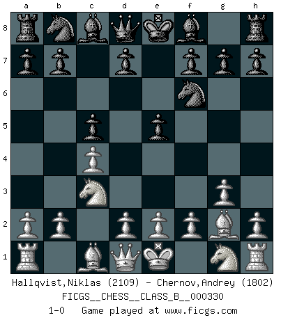 Last move : 1-0 2020 October 16 1:8:14 [Event "FICGS__CHESS__CLASS_B__000330"] [Site "FICGS"] [Date "2020.09.05"] [Round "1"] [White "Hallqvist,Niklas"] [Black "Chernov,Andrey"] [Result "1-0"] [WhiteElo "2109"] [BlackElo "1802"] 1.c4 e5 2.g3 c5 3.Bg2 Nf6 4.Nc3 1-0 This chess game has been lost on time (started : 2020.09.05 17:6:11) English Opening Player White won this chess game. Follow this game move after move (download)Life is like a game of Chess, changing with each move. (Chinese proverb) Darum geht es im Schach. Einen Tag gibst du deinem Gegner eine Lektion, am nächsten Tag gibt er dir eine. (Robert James Fischer) El juego de Fischer siempre fue nítido, racional y brillante. Uno de los mejores por siempre. (Dave Regis) Le moment que je préfère le plus dans une rencontre, c'est celui où je sens que la personnalité de l'adversaire se brise. (Robert Fischer) The only difference between a tax man and a taxidermist is that the taxidermist leaves the skin. (Mark Twain)