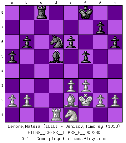 Last move : 0-1 2021 January 17 23:33:34 [Event "FICGS__CHESS__CLASS_B__000330"] [Site "FICGS"] [Date "2020.09.05"] [Round "1"] [White "Benone,Mateia"] [Black "Denisov,Timofey"] [Result "0-1"] [WhiteElo "1816"] [BlackElo "1953"] 1.Nf3 d5 2.d4 Nf6 3.c4 e6 4.Nc3 Bb4 5.Bg5 h6 6.Bxf6 Qxf6 7.e3 O-O 8.Bd3 dxc4 9.Bxc4 b6 10.Qb3 Bxc3+ 11.Qxc3 Bb7 12.Be2 Rc8 13.O-O Nd7 14.Rac1 c5 15.Rfd1 a5 16.dxc5 Qxc3 17.Rxc3 Nxc5 18.Bb5 Ne4 19.Rxc8+ Rxc8 20.Ne1 Bd5 21.f3 Nd6 22.Be2 f5 23.Kf2 Kf8 0-1 This chess game has been lost on time (started : 2020.09.05 17:6:11) Follow this game move after move (download)Chess is a sea in which a gnat may drink and an elephant may bathe. (Hindu proverb) Sicherlich können nur Meister einen Stil haben. Daß ein nicht-Meister auch nur ein einziges Mal in seinem Leben eine Partie folgerecht durchführte, habe ich niemals bemerkt. (Emanuel Lasker) Un entendimiento a fondo de las continuaciones típicas del mate, hace de las combinaciones de sacrificio mas complicadas conducirlas a ellas no solo sin dificultad, sino casi de una manera natural. (Siegbert Tarrasch) Psychologiquement, tu dois avoir confiance en toi même, mais cette confiance doit être basée sur des faits. (Robert Fischer) Life doesn't imitate art, it imitates bad television. (Woody Allen)