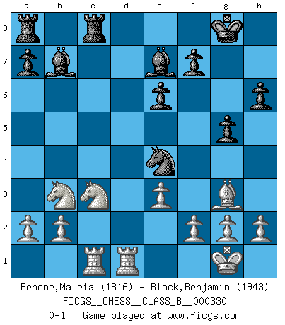 Last move : 0-1 2021 January 30 12:19:21 [Event "FICGS__CHESS__CLASS_B__000330"] [Site "FICGS"] [Date "2020.09.05"] [Round "1"] [White "Benone,Mateia"] [Black "Block,Benjamin"] [Result "0-1"] [WhiteElo "1816"] [BlackElo "1943"] 1.Nf3 d5 2.d4 Nf6 3.c4 e6 4.Nc3 Be7 5.Bg5 h6 6.Bh4 O-O 7.e3 b5 8.Nxb5 c6 9.Nc3 Nbd7 10.Bd3 Qb6 11.Rb1 dxc4 12.Bxc4 c5 13.O-O cxd4 14.Nxd4 Bb7 15.Qb3 Rfc8 16.Rbc1 g5 17.Bg3 Qxb3 18.Bxb3 Nc5 19.Rfd1 Nxb3 20.Nxb3 Ne4 0-1 This chess game has been lost on time (started : 2020.09.05 17:6:11) Follow this game move after move (download)The hardest game to win is a won game. (Emanuel Lasker) Privat ist Kortschnoi kein schlechter Mensch, sehr sympathisch. Aber während des Spiels ist er grausam. Er will dich töten. (Miguel Najdorf) Si tu oponente no puede hacer nada activo, entonces no apures la posición; En vez de eso, dejalo estar sentado ahí, sufriendo y rogandote por un empate. (Jeremy Silman) Comme les marins qui ont mille raisons différentes d'aller en mer, les joueurs d'échecs en ont tout autant avant de s'installer devant une table et jouer... (Vincent Bertignac, philosophe) Wisdom is the reward you get for a lifetime of listening when you'd have preferred to talk. (Doug Larson)