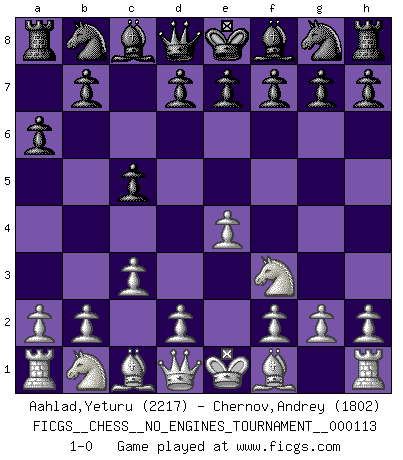 Last move : 1-0 2020 October 18 20:49:38 [Event "FICGS__CHESS__NO_ENGINES_TOURNAMENT__000113"] [Site "FICGS"] [Date "2020.09.06"] [Round "1"] [White "Aahlad,Yeturu"] [Black "Chernov,Andrey"] [Result "1-0"] [WhiteElo "2217"] [BlackElo "1802"] 1.e4 c5 2.Nf3 a6 3.c3 1-0 This chess game has been lost on time (started : 2020.09.06 10:30:7) Sicilian : O'Kelly variation Player White won this chess game. Follow this game move after move (download)Not only will I predict his triumph over Botvinnik, but I'll go further and say that he'll probably be the greatest Chess player that ever lived. (John Collins) Kann Schach nicht schließlich das Nationalspiel der Deutschen werden? Und welche weiteren Ausblicke bieten sich dann dar! Welche Hebung des allgemeinen Kultur-Niveaus, ja der Moral, wenn das Schachbrett den Kartentisch verdrängen würde! Wahrlich, ein Ziel, des Schweißes der Edlen wert! (Siegbert Tarrasch) Durante una competencia de Ajedrez, un Maestro de Ajedrez deberá ser una combinación de presa de caza y un Monge. (Alexander Alekhine) Il s'avisa de me proposer d'apprendre les échecs qu'il jouait un peu... me voilà forcené des échecs. J'achète un échiquier, je m'enferme dans ma chambre, j'y passe des jours et des nuits à vouloir apprendre par cur toutes les parties. (Jean-Jacques Rousseau, Confessions) Whatever you do, don't be bored. This is absolutely the most exciting time we could have possibly hoped to be alive. And things are just starting. (From movie Waking life)