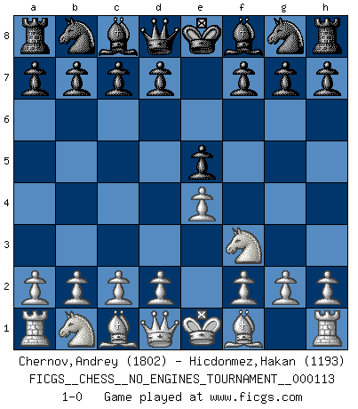 Last move : 1-0 2020 October 20 12:37:36 [Event "FICGS__CHESS__NO_ENGINES_TOURNAMENT__000113"] [Site "FICGS"] [Date "2020.09.06"] [Round "1"] [White "Chernov,Andrey"] [Black "Hicdonmez,Hakan"] [Result "1-0"] [WhiteElo "1802"] [BlackElo "1193"] 1.e4 e5 2.Nf3 1-0 This chess game has been lost on time (started : 2020.09.06 10:30:7) King's knight Opening Player White won this chess game. Follow this game move after move (download)Help your pieces so they can help you. (Paul Morphy) Es ist schade, dass viele Schachsportler vergessen, wie wichtig Auftreten und angemessene Kleidung sind. (Alexandra Kosteniuk) El sobresalir en el Ajedrez es un signo de una mente intrigante. (Sir Arthur Conan Doyle) Les échecs c'est le défi de l'alpiniste, toujours plus haut, prêt à tout pour monter à l'assaut du Roi ennemi. Les échecs, c'est de la musique en mouvement, un ballet majestueux pour les yeux. C'est de la poésie composée par les fantômes du passé qui au même titre que Rimbaud ou Verlaine méritent notre admiration. Les échecs, c'est de la peinture ou le moindre mouvement modifie le tableau pour en faire un Picasso ou un Van Gogh. Les échecs, c'est tout et rien, c'est la vie et la mort. Jjulie33 sur le forum de France-Echecs. Computer Science is no more about computers than astronomy is about telescopes. (Edsger W. Dijkstra)