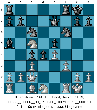Last move : 0-1 2020 November 27 10:30:17 [Event "FICGS__CHESS__NO_ENGINES_TOURNAMENT__000113"] [Site "FICGS"] [Date "2020.09.06"] [Round "1"] [White "Alvar,Juan"] [Black "Ward,David"] [Result "0-1"] [WhiteElo "1449"] [BlackElo "2013"] 1.e4 e5 2.Nc3 Nf6 3.Bc4 Bb4 4.Nge2 O-O 5.O-O c6 6.Bb3 d5 7.d3 Bg4 8.f3 Be6 9.d4 exd4 10.Qxd4 c5 11.Qf2 d4 12.Bxe6 fxe6 13.Nd1 Nc6 14.Nf4 Qd7 15.c3 Ba5 16.Qc2 e5 17.Nd3 c4 18.Nc5 Qe7 0-1 Follow this game move after move (download)Examine moves that smite! A good eye for smites is far more important than a knowledge of strategical principles. (Purdy) In Buenos Aires ist es nicht mein vorrangiges Ziel ein starkes Turnier zu organisieren, sondern ein Turnier für Gentlemen. Ich würde nie Kamsky einladen. Ich mag keine Probleme. (Miguel Najdorf) Si tu oponente no puede hacer nada activo, entonces no apures la posición; En vez de eso, dejalo estar sentado ahí, sufriendo y rogandote por un empate. (Jeremy Silman) J'ai toujours senti une vague pitié pour l'homme qui ne connaît rien aux échecs, tout comme j'en aurais pour un homme ignorant de l'amour. Les Echecs, comme la musique ou comme l'amour, ont le pouvoir de rendre heureux. (Siegbert Tarrasch) Life is verb, not a noun. (Charlotte Perkins Gilman)