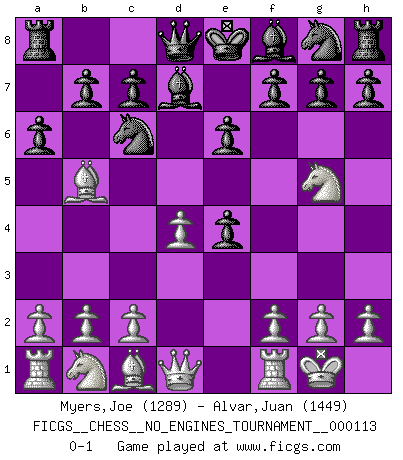 Last move : 0-1 2020 November 1 9:8:36 [Event "FICGS__CHESS__NO_ENGINES_TOURNAMENT__000113"] [Site "FICGS"] [Date "2020.09.06"] [Round "1"] [White "Myers,Joe"] [Black "Alvar,Juan"] [Result "0-1"] [WhiteElo "1289"] [BlackElo "1449"] 1.e4 e6 2.e5 d6 3.Nf3 Nc6 4.d4 dxe5 5.Bb5 Bd7 6.O-O e4 7.Ng5 a6 0-1 This chess game has been lost on time (started : 2020.09.06 10:30:7) French : Steinitz attack Kingside Castling by player White (move 6) Player Black won this chess game. Follow this game move after move (download)If cunning alone were needed to excel, women would be the best Chess players. (Albin) Das Schachspiel ist ein See, in welchem eine Mücke baden und ein Elefant ertrinken kann. (Emanuel Lasker) No hay otro maestro que tenga una voluntad terrífica de ganar. Al tablero, el irradía peligro y aún los oponentes mas fuertes tienden a congelarse como liebres cuando olfatean a una pantera. Aún sus debilidades son peligrosas. Con las blancas, su juego de apertura es predecible - te es posible hacer planes en su contra - pero es tan fuerte que tus planes casi nunca funcionan. En el juego medio, su precisión e invención son fabulosas y en finales, tú simplemente no le puedes vencer. (Experto Alemán anónimo) Il n'y a pas de prix trop élevé au scalp de l'ennemi. (Koblentz) Difficult things take a long time, impossible things a little longer. (Author unknown)