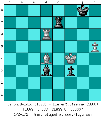 Last move : 1/2-1/2 2006 September 23 16:59:56 [Event "FICGS__CHESS__CLASS_C__000007"] [Site "FICGS"] [Date "2006.06.21"] [Round "1"] [White "Baron,Ovidiu"] [Black "Clement,Etienne"] [Result "1/2-1/2"] [WhiteElo "1623"] [BlackElo "1600"] 1.Nf3 g6 2.d4 Bg7 3.c4 c5 4.e3 Nf6 5.Nc3 O-O 6.dxc5 Na6 7.Be2 Nxc5 8.O-O d6 9.Nd4 Qb6 10.b3 Rd8 11.Bb2 e5 12.Nf3 Bf5 13.Ng5 h6 14.Nf3 a5 15.Ba3 Nce4 16.Na4 Qa7 17.Qe1 b6 18.Rd1 Qc7 19.Bb2 Rac8 20.Rc1 Nc5 21.Nxc5 bxc5 22.Nh4 Bd7 23.f4 a4 24.Bc3 Re8 25.fxe5 dxe5 26.Bd3 axb3 27.axb3 Bc6 28.Ba5 Qa7 29.Ra1 Qd7 30.Be2 Rb8 31.b4 cxb4 32.Bxb4 Ne4 33.Rd1 Qa7 34.Bf3 Qa4 35.Bxe4 Bxe4 36.Bd6 Rb2 37.c5 g5 38.Nf3 g4 39.Nd2 Bd3 40.Rf2 Ra2 41.Rc1 Ra8 42.Nb1 Rxf2 43.Kxf2 e4 44.Nc3 Qb3 45.Kg1 h5 46.Nd1 Bb5 47.Bg3 Bc6 48.Bd6 Ra2 49.h3 gxh3 50.gxh3 Qd3 51.Qg3 f6 52.Nf2 Qe2 53.Rb1 Kf7 54.h4 Qd2 55.Rb6 Bd5 56.Qf4 Qe1 57.Kg2 Qd1 58.Qf5 Ba8 59.Bg3 Qf3 60.Qxf3 exf3 61.Kg1 Rc2 62.Ra6 Bd5 63.e4 Be6 64.Ra7+ Kg6 65.Ra6 Bc8 66.Rc6 Bd7 67.Rc7 Bb5 68.Bf4 Bf8 69.Be3 Re2 70.Bf4 Ba4 71.Rc8 Kf7 72.Rc7+ Ke6 73.Rc8 Be7 74.c6 f5 75.c7 Bd7 76.Re8 Rc2 77.exf5+ Kf7 78.Rh8 Bxf5 79.Rxh5 Kg6 80.Rh6+ Kg7 81.Rh5 Bc8 82.Bg3 Bc5 83.Rg5+ Kh6 84.Rd5 Kg6 85.h5+ Kh7 86.Rd8 Bb7 87.Bh4 Kh6 88.Rh8+ Kg7 89.Rb8 Bxf2 90.Bxf2 Rxc7 91.Be3 Rf7 92.Kf2 Be4 93.Rb6 Rc7 94.Kg3 Kh7 95.Rh6+ Kg8 96.Rd6 Rg7 97.Kf4 Re7 98.Bd4 Bd3 1/2-1/2 Reti Opening Kingside Castling by player Black (move 5) Kingside Castling by player White (move 8) 10 pieces endgame at move 89 : White KRBPP , Black KRBBP WHITE : King + 1 Rook 1 Bishop 2 Pawns BLACK : King + 1 Rook 2 Bishops 1 Pawn 9 pieces endgame at move 90 : White KRBPP , Black KRBP WHITE : King + 1 Rook 1 Bishop 2 Pawns BLACK : King + 1 Rook 1 Bishop 1 Pawn 8 pieces endgame at move 90 : White KRBP , Black KRBP WHITE : King + 1 Rook 1 Bishop 1 Pawn BLACK : King + 1 Rook 1 Bishop 1 Pawn This chess game ended in a draw. Follow this game move after move (download)Chess is not like life... it has rules ! (Mark Pasternak) Wenn Capablanka heute auf der Schachbühne erscheinen würde, hätte er ein halbes Jahr gebraucht um sich die Schachtheorie anzueignen. Und dann hätte er alles und jeden besiegt. (Mikhail Moiseyevich Botvinik) No puedes jugar al Ajedrez si eres de corazón noble. (Proverbio Francés) Un footballeur joue avec ses pieds, parfois avec sa tête. Un joueur d'échecs ne joue qu'avec sa tête. Et quand il ne joue plus, il meurt. (Jacob Murray) A person who never made a mistake never tried anything new. (Albert Einstein)
