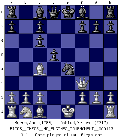 Last move : 0-1 2020 October 29 16:41:44 [Event "FICGS__CHESS__NO_ENGINES_TOURNAMENT__000113"] [Site "FICGS"] [Date "2020.09.06"] [Round "1"] [White "Myers,Joe"] [Black "Aahlad,Yeturu"] [Result "0-1"] [WhiteElo "1289"] [BlackElo "2217"] 1.e4 e5 2.Nf3 Nc6 3.d4 exd4 4.Nxd4 Nf6 5.Nxc6 bxc6 6.Bc4 Nxe4 7.Qf3 d5 0-1 This chess game has been lost on time (started : 2020.09.06 10:30:7) Scotch : Schmidt variation Player Black won this chess game. Follow this game move after move (download)When the Chess game is over, the Pawn and the King go back to the same box. (Irish saying) Je mehr wir mit Computern analysieren, desto mehr glauben wir an Verteidigung. (Vladimir Kramnik) Personalmente, yo prefiero mirar hacia el futuro en donde un programa de computadora gane el título mundial de Ajedrez. La humanidad necesita una lección de humildad. (Richard Dawkings) Je ne suis pas le dernier à jouer lâchement des coups douteux pendant le zeïtnot de l'adversaire pour l'achever: en effet les coups qui font le plus peur sont ceux que l'on ne comprend pas. Je me fais souvent peur quand je joue. (Un professeur anonyme) All politicians must be presumed guilty until they are proven innocent. (Dinesh De Silva)