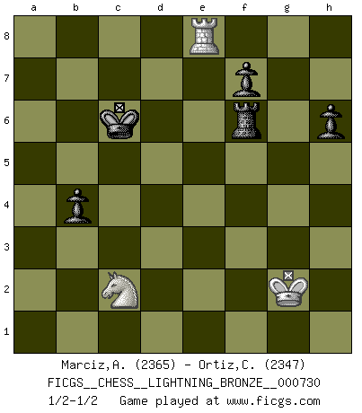 Last move : 1/2-1/2 2020 September 7 16:26:14 [Event "FICGS__CHESS__LIGHTNING_BRONZE__000730"] [Site "FICGS"] [Date "2020.09.07"] [Round "1"] [White "Marciz,Alexander"] [Black "Ortiz,Clodomiro"] [Result "1/2-1/2"] [WhiteElo "2365"] [BlackElo "2347"] 1.d4 Nf6 2.Nf3 e6 3.c4 d5 4.Bg5 Be7 5.Nc3 h6 6.Bh4 O-O 7.e3 b6 8.Be2 Bb7 9.Bxf6 Bxf6 10.cxd5 exd5 11.b4 c6 12.O-O Re8 13.Qb3 a5 14.bxa5 Rxa5 15.a4 Bc8 16.Bd3 Ba6 17.Bxa6 Rxa6 18.Rfc1 Ra5 19.Ne2 Re6 20.g3 Nd7 21.Nf4 Rd6 22.h4 c5 23.Kg2 Qa8 24.Qd1 Bd8 25.Ne2 Nf6 26.Nc3 Rc6 27.Ne5 Re6 28.Rab1 Bc7 29.Nf3 c4 30.Nd2 Bd8 31.Rb2 Re8 32.Rb4 Qc6 33.Rcb1 Qe6 34.Qf3 Re7 35.Re1 Rd7 36.Qe2 Be7 37.R4b1 Ra8 38.Rec1 g6 39.Rb5 Kg7 40.Rcb1 Bd8 41.Rc1 Ra5 42.R5b1 Re7 43.Rc2 Re8 44.Rcb2 Bc7 45.e4 Nxe4 46.Ndxe4 dxe4 47.Rb4 e3 48.Rxc4 Qd6 49.Nb5 Qd5+ 50.f3 Bb8 51.Rbc1 g5 52.Rc8 Rxc8 53.Rxc8 Bxg3 54.Kxg3 gxh4+ 55.Kh2 Rxa4 56.Qg2+ Kf6 57.Nc3 Qd6+ 58.Kh3 Qe6+ 59.Qg4 Rxd4 60.Ne4+ Ke7 61.Qxe6+ Kxe6 62.Re8+ Kd7 63.Nf6+ Kc6 64.Ng4 b5 65.Nxe3 Rf4 66.Kg2 b4 67.Kf2 h3 68.Kg3 h2 69.Kxh2 Rxf3 70.Kg2 Rf6 71.Nc2 1/2-1/2 Queen's pawn game Kingside Castling by player Black (move 6) Kingside Castling by player White (move 12) 10 pieces endgame at move 65 : White KRNP , Black KRPPPP WHITE : King + 1 Rook 1 Knight 1 Pawn BLACK : King + 1 Rook 4 Pawns 9 pieces endgame at move 69 : White KRNP , Black KRPPP WHITE : King + 1 Rook 1 Knight 1 Pawn BLACK : King + 1 Rook 3 Pawns 8 pieces endgame at move 69 : White KRN , Black KRPPP WHITE : King + 1 Rook 1 Knight BLACK : King + 1 Rook 3 Pawns This chess game ended in a draw. Follow this game move after move (download)The King is a fighting piece. Use it ! (Wilhelm Steinitz) Matt entspricht nicht immer den Tatsachen. (Savielly Grigorievitsch Tartakower) ¡Examina movidas que hagan daño! Un buen ojo for movidas desvastantes es mucho mas importante que el conocimiento de principios estratégicos. (Purdy) La tactique est l'élément le plus important du milieu de jeu. (Siegbert Tarrasch) What doesn't kill us makes us stronger. (Friedrich Nietzsche)