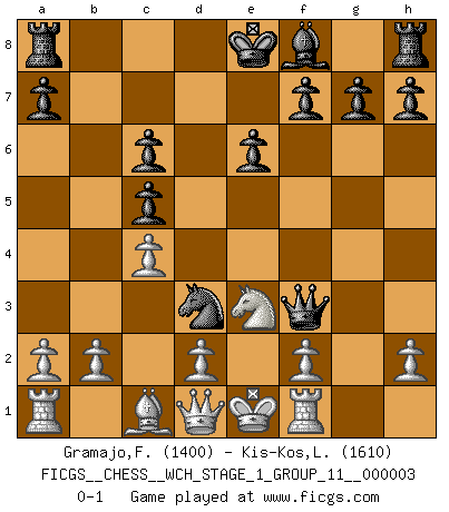 Last move : 0-1 2007 August 3 11:0:31 [Event "FICGS__CHESS__WCH_STAGE_1_GROUP_11__000003"] [Site "FICGS"] [Date "2007.07.11"] [Round "1"] [White "Gramajo,Francisco"] [Black "Kis-Kos,Laszlo"] [Result "0-1"] [WhiteElo "1400"] [BlackElo "1610"] 1.e4 c5 2.Bc4 e6 3.Nf3 d6 4.e5 Nc6 5.Bb5 Bd7 6.Bxc6 Bxc6 7.c4 dxe5 8.Nxe5 Qg5 9.Nxc6 Qxg2 10.Rf1 bxc6 11.Nc3 Nf6 12.Qa4 Ng4 13.Nd5 Ne5 14.Ne3 Qf3 15.Qd1 Nd3+ 0-1 Sicilian defense Player Black won this chess game. Follow this game move after move (download)Pawn endings are to Chess what putting is to golf. (Cecil Purdy) Sicherlich können nur Meister einen Stil haben. Daß ein nicht-Meister auch nur ein einziges Mal in seinem Leben eine Partie folgerecht durchführte, habe ich niemals bemerkt. (Emanuel Lasker) Un entendimiento minucioso de las típicas continuaciones de mate hacen de las mas complicadas combinaciones de sacrificio que conducen hacia ellas no solo no dificiles, sino casi un asunto de rutina. (Siegbert Tarrasch) Je ne crois pas en la psychologie, je crois aux bons coups. (Robert Fischer) To be champion requires more than simply being a strong player; one has to be a strong human being as well. (Anatoly Karpov)