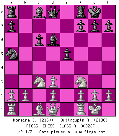 Last move : 1/2-1/2 2020 December 28 18:33:42 [Event "FICGS__CHESS__CLASS_A__000237"] [Site "FICGS"] [Date "2020.09.08"] [Round "1"] [White "Moreira,Jose"] [Black "Duttagupta,Aniruddha"] [Result "1/2-1/2"] [WhiteElo "2150"] [BlackElo "2138"] 1.e4 e5 2.Nf3 Nc6 3.Bc4 Nf6 4.Ng5 d5 5.exd5 Na5 6.Bb5+ c6 7.dxc6 bxc6 8.Bd3 Nd5 9.Nf3 Bd6 10.O-O Nf4 11.Nc3 Nxd3 12.cxd3 O-O 1/2-1/2 Follow this game move after move (download)Whoever sees no other aim in the game than that of giving checkmate to one's opponent will never become a good Chess player. (Euwe) Ich spiele ehrlich und spiele, um zu gewinnen. Wenn ich verliere nehme ich meine Medizin. (Robert James Fischer) Los asuntos humanos son como una partida de Ajedrez: solo aquellos que no lo toman seriamente, pueden ser llamados buenos jugadores. (Hung Tzu Ch'eng) Des idées, des idées, j'en ai cent, j'en ai mille. Des bonnes, des mauvaises, applicables, irréalisables... Il suffit de faire le tri ! (Roos) All war is based on deception. (Sun Tzu)